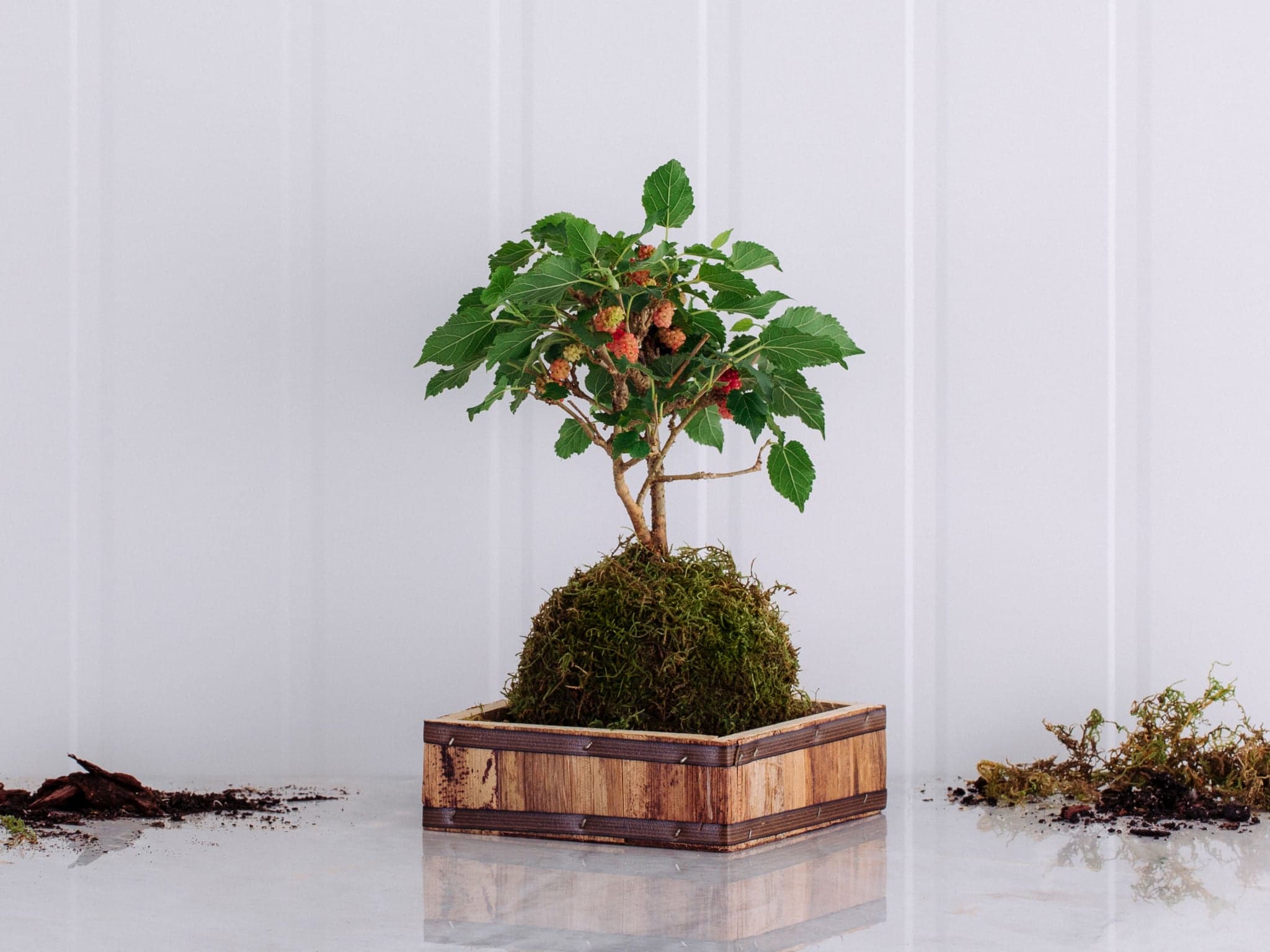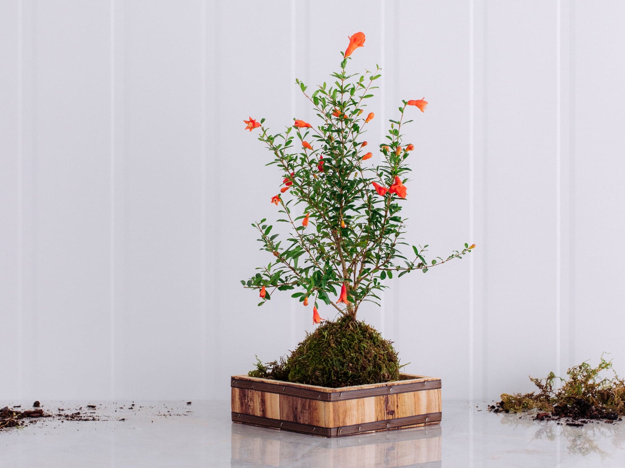 Kokedama Bonsai de Romã em Caixa de Madeira