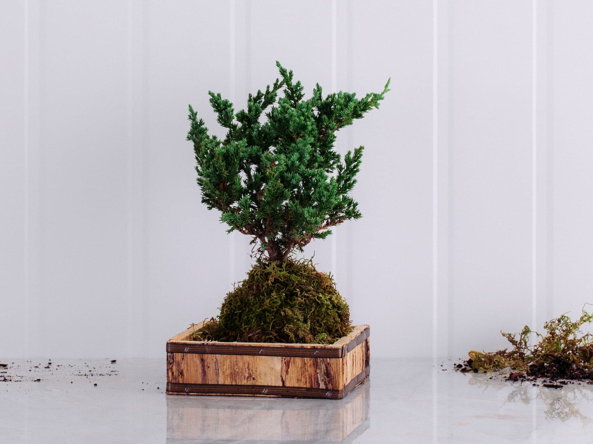 Kokedama de Bonsai de Pinheiro em Caixa de Madeira