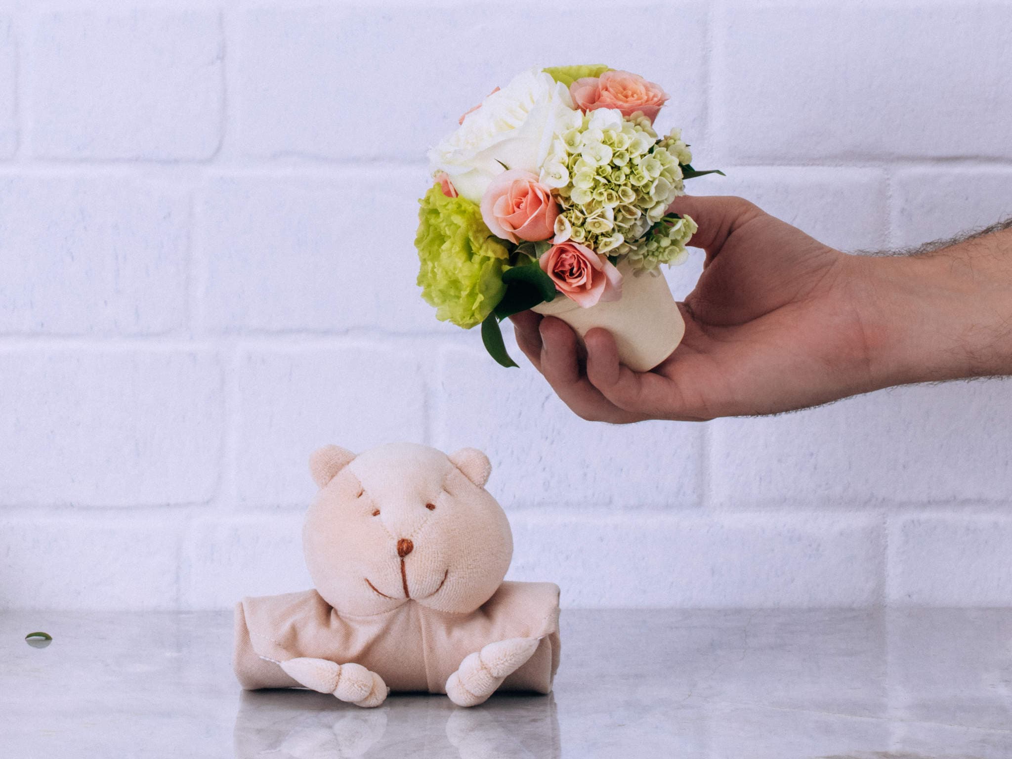 4.9Arranjo de Flores Coloridas com Urso de Pelúcia Naninha