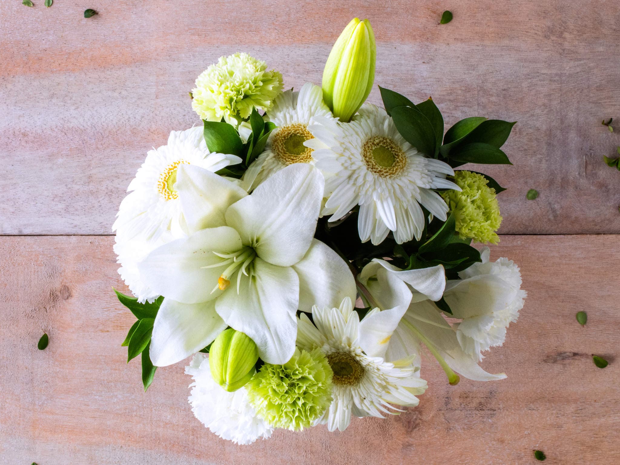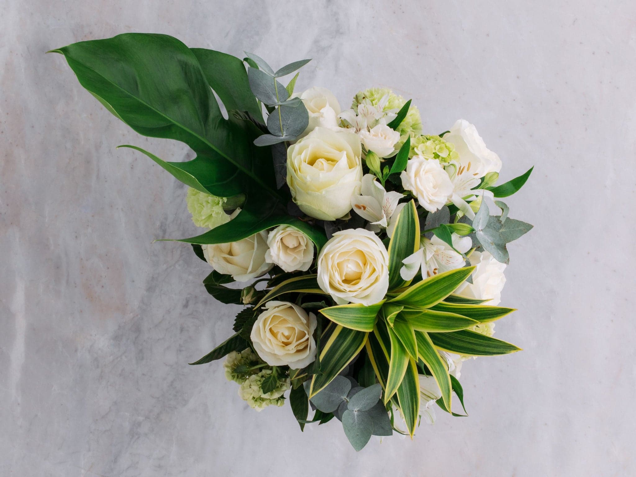 4.8Arranjo de Rosas e Alstroemérias Brancas em Vaso com Folhagens