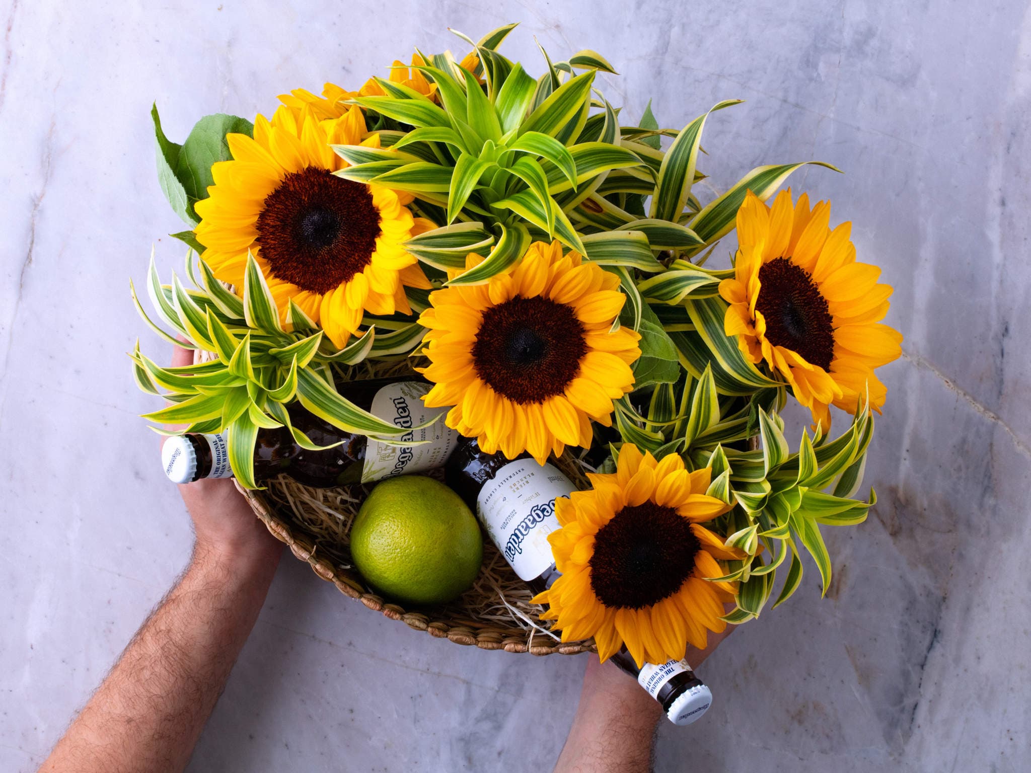 Cesta com Girassóis, Cerveja Hoegaarden Witbier e Fruta
