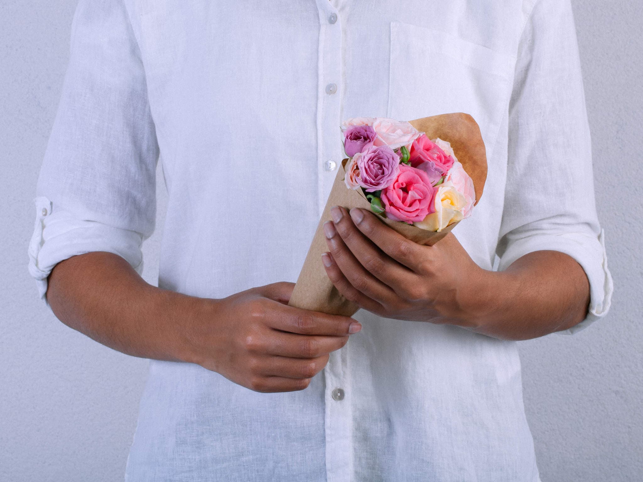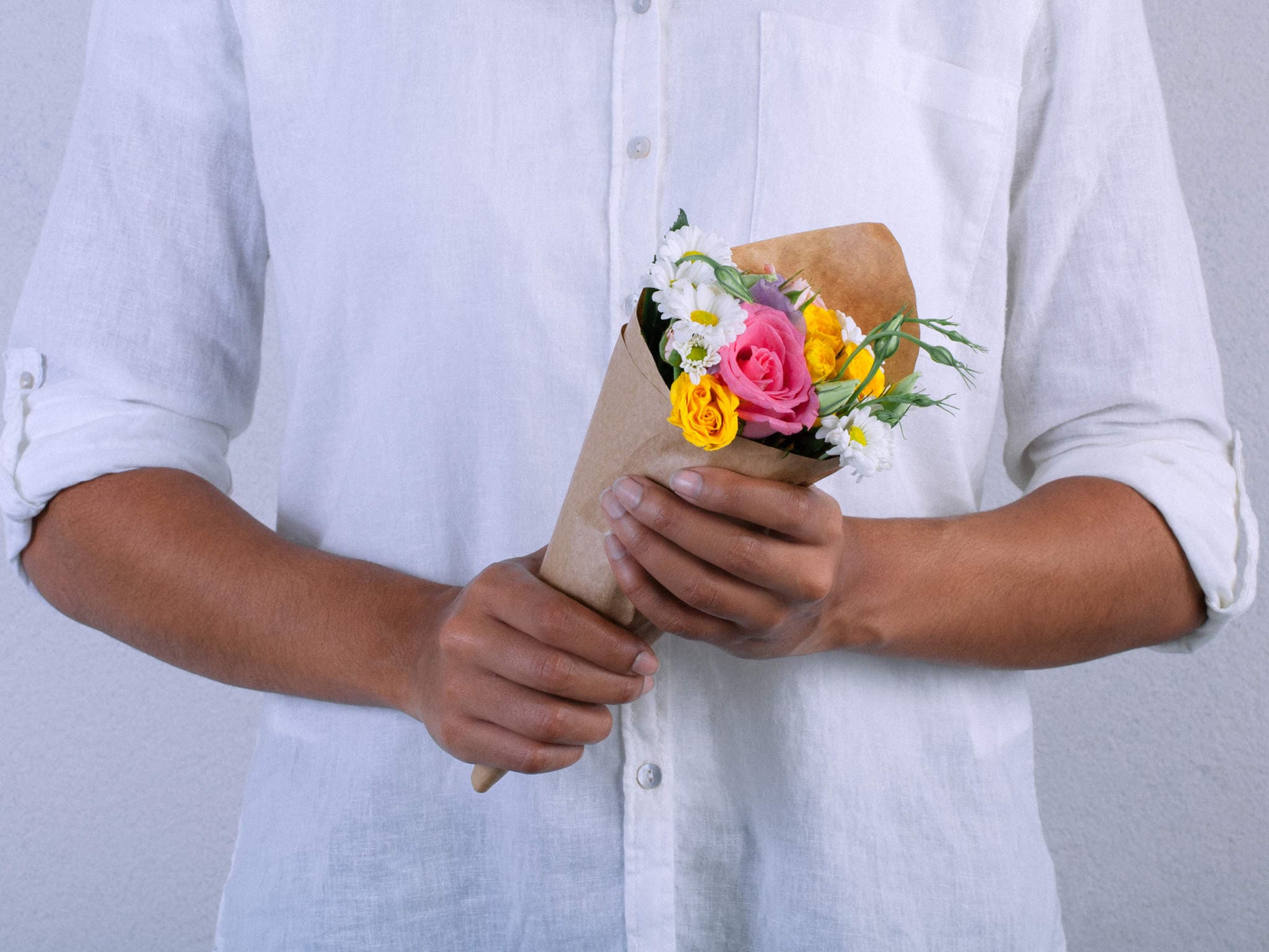 Buquê de Rosas, Lisianthus e Margaridinhas em Folha Kraft
