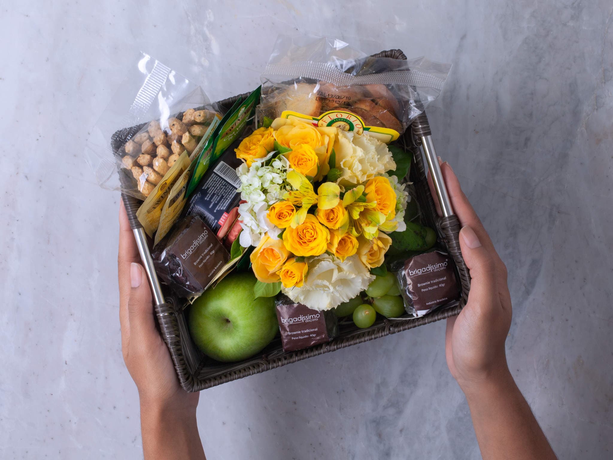 Cesta de Presente com Flores, Frutas e Guloseimas Para Entrega