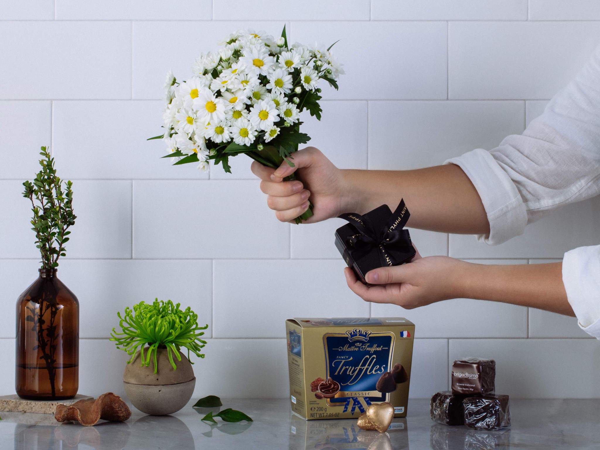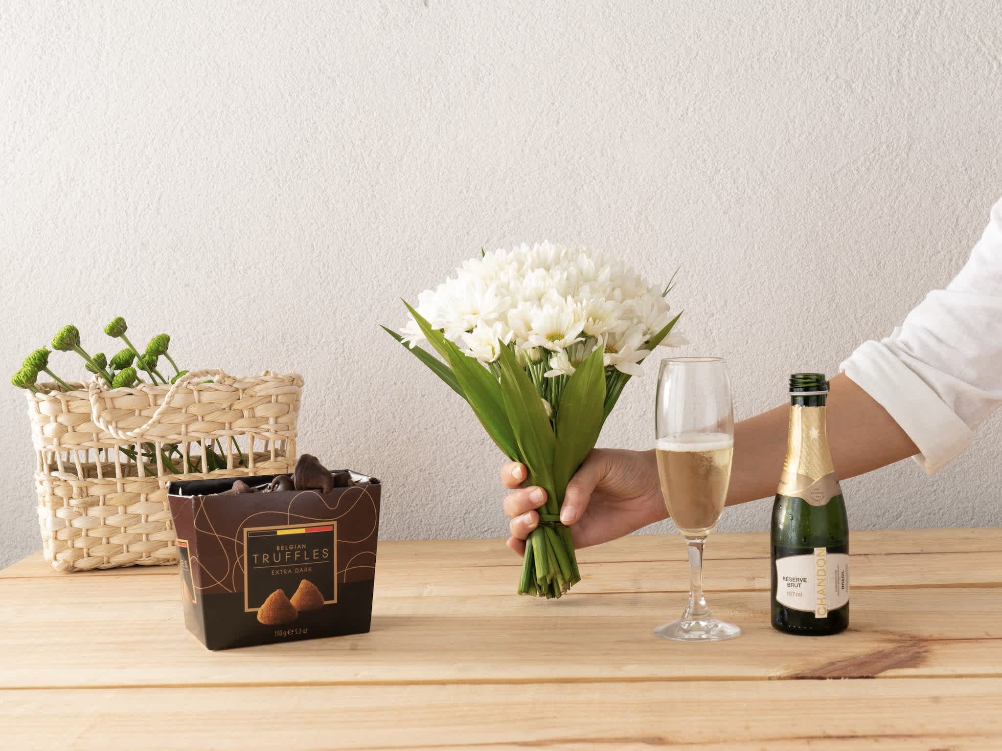Buquê de Margaridinhas, Trufas e Baby Chandon Para Entrega