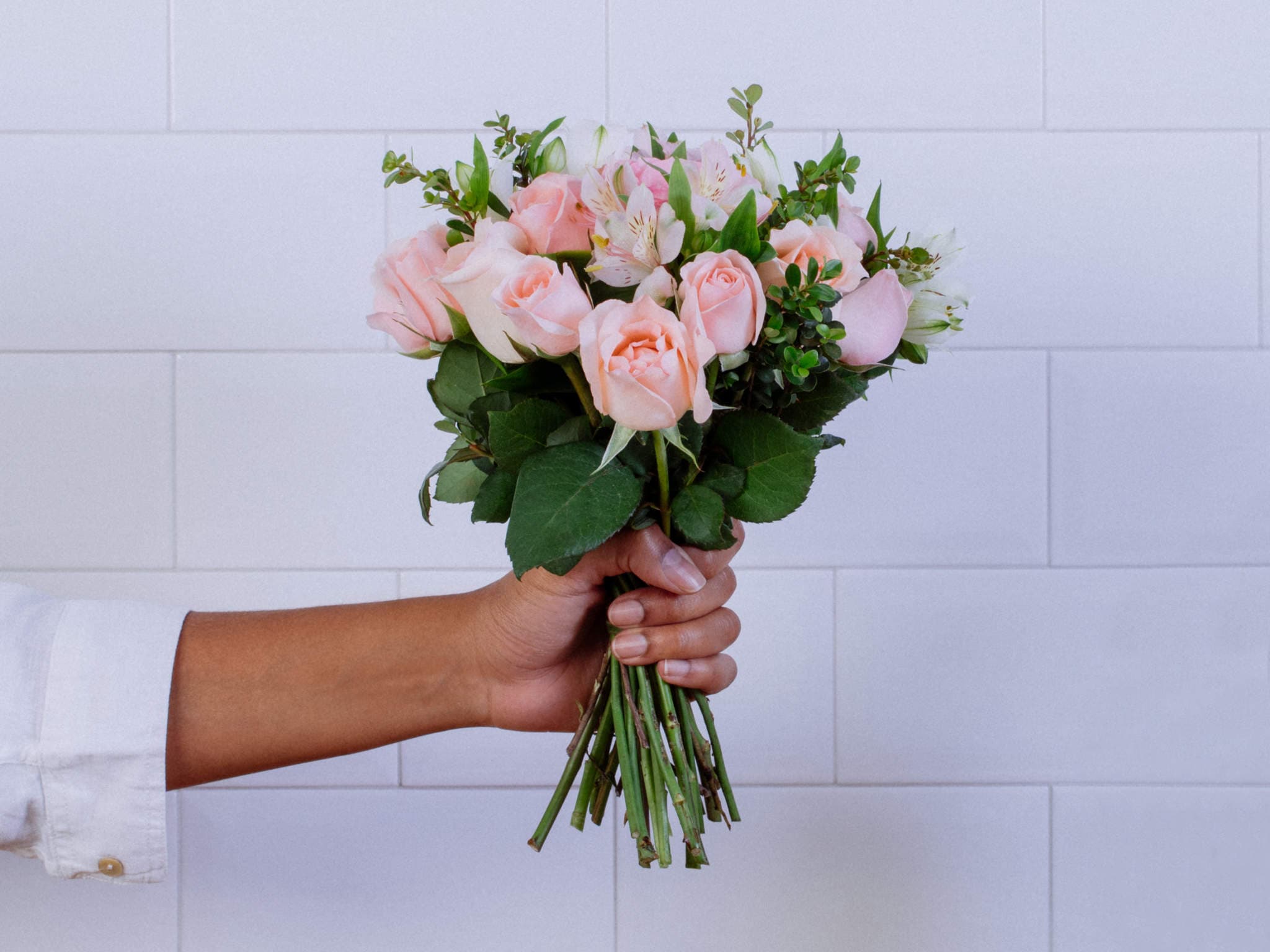 4.7Buquê de Rosas e Alstroemérias Rosadas com Folhagem Para Entrega