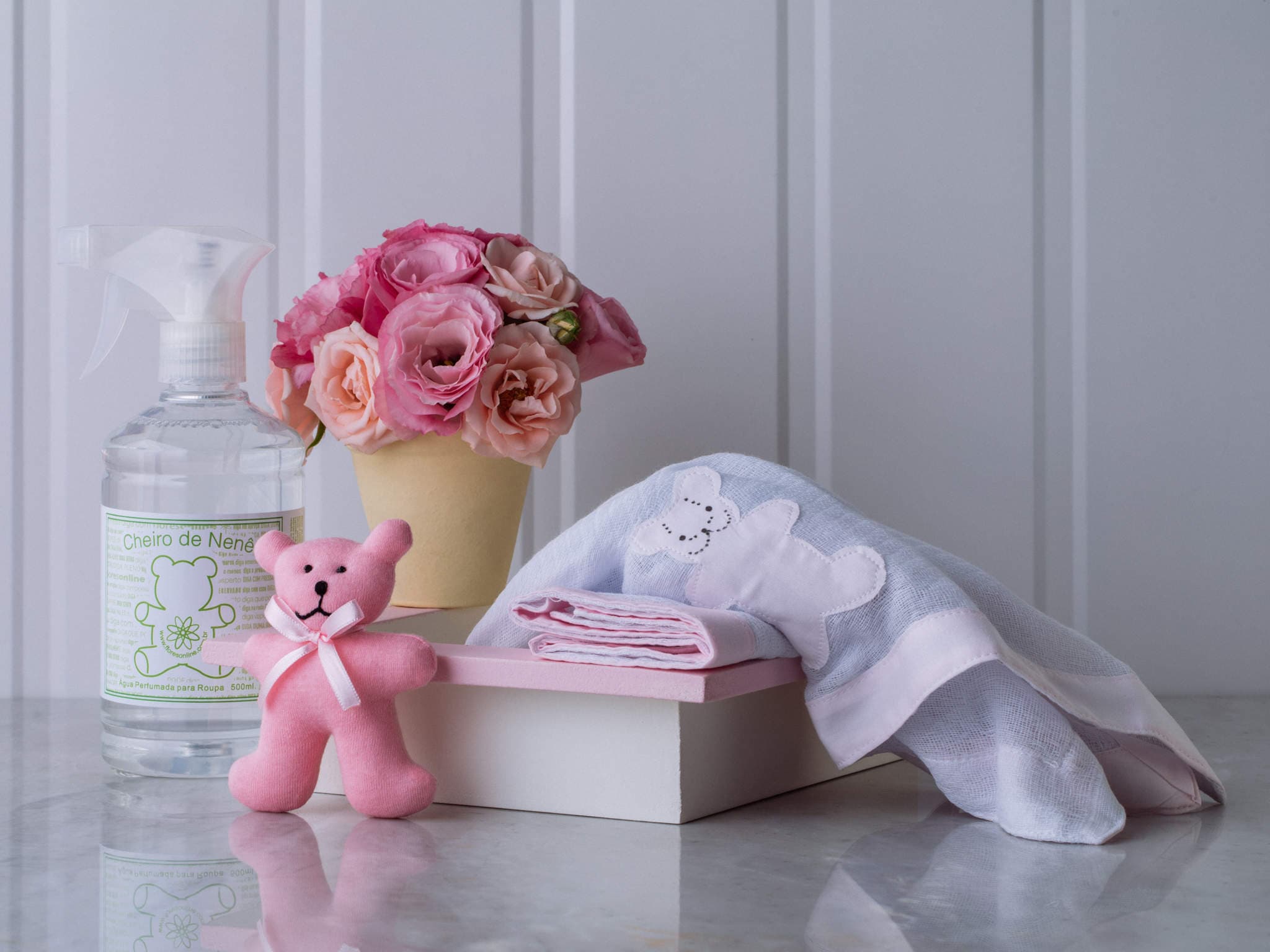 Cesta Maternidade com Arranjo de Flores, Ursinho e Água Perfumada