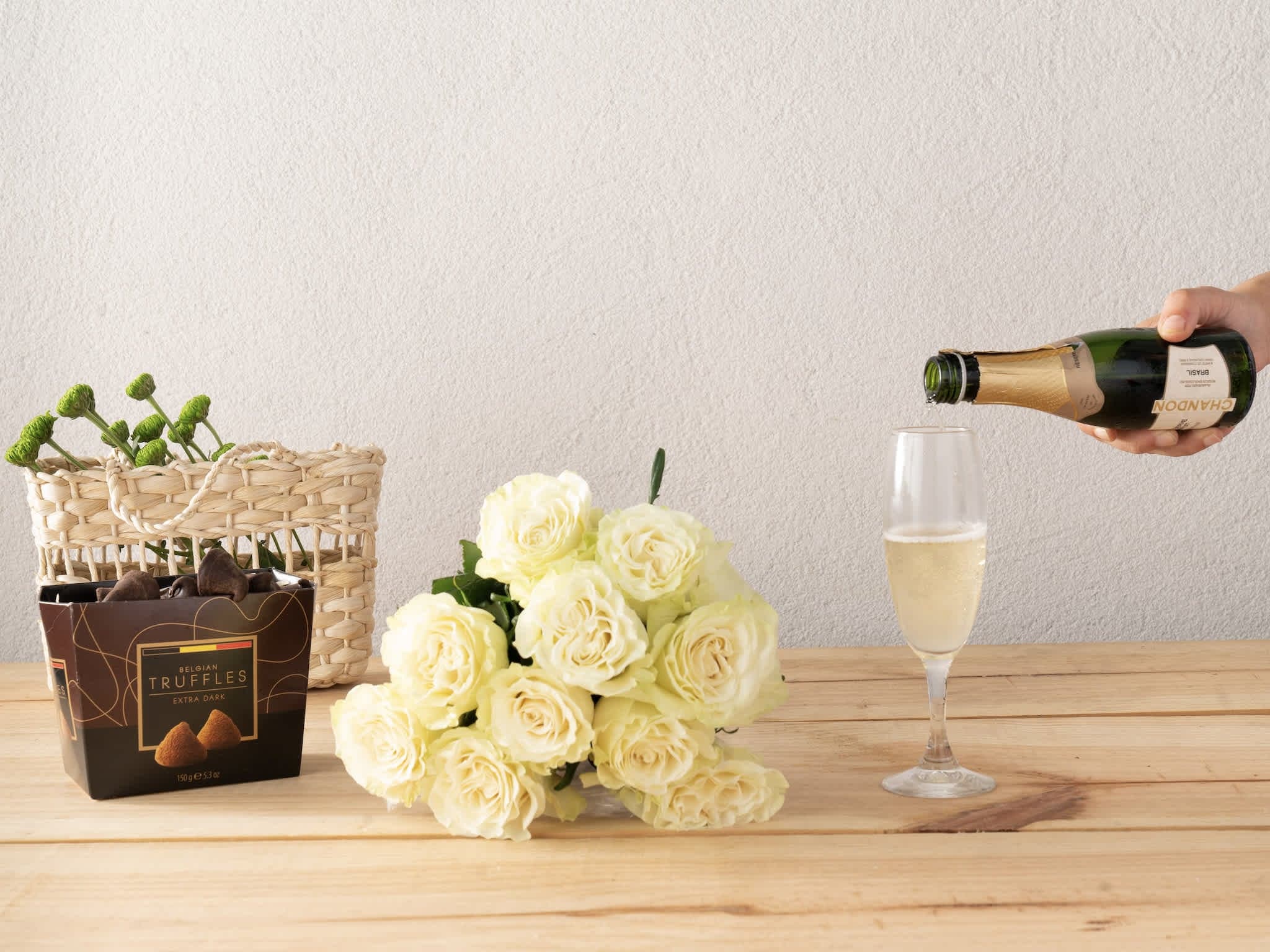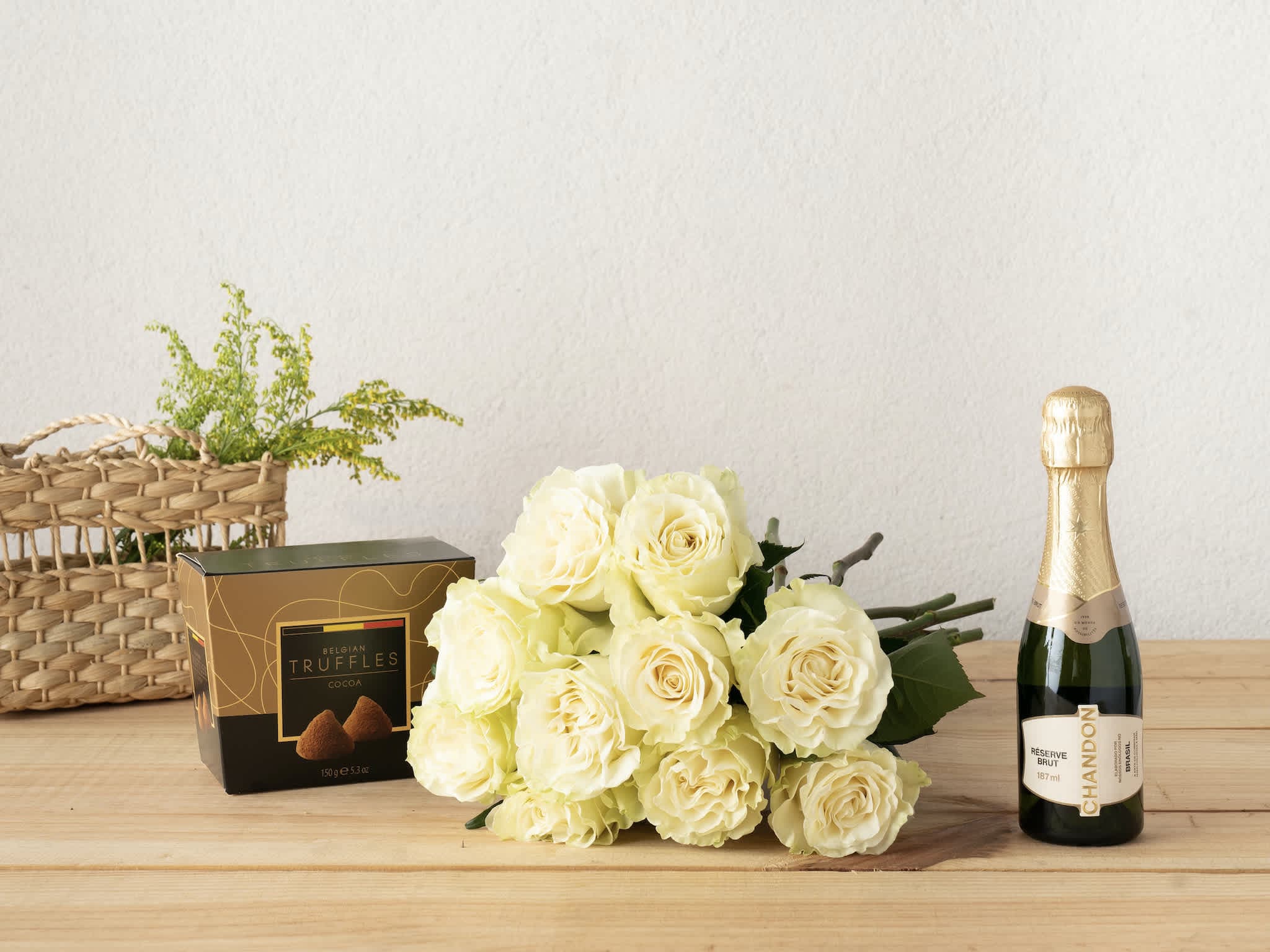 10 Rosas Brancas, Trufas e Baby Chandon Para Entrega