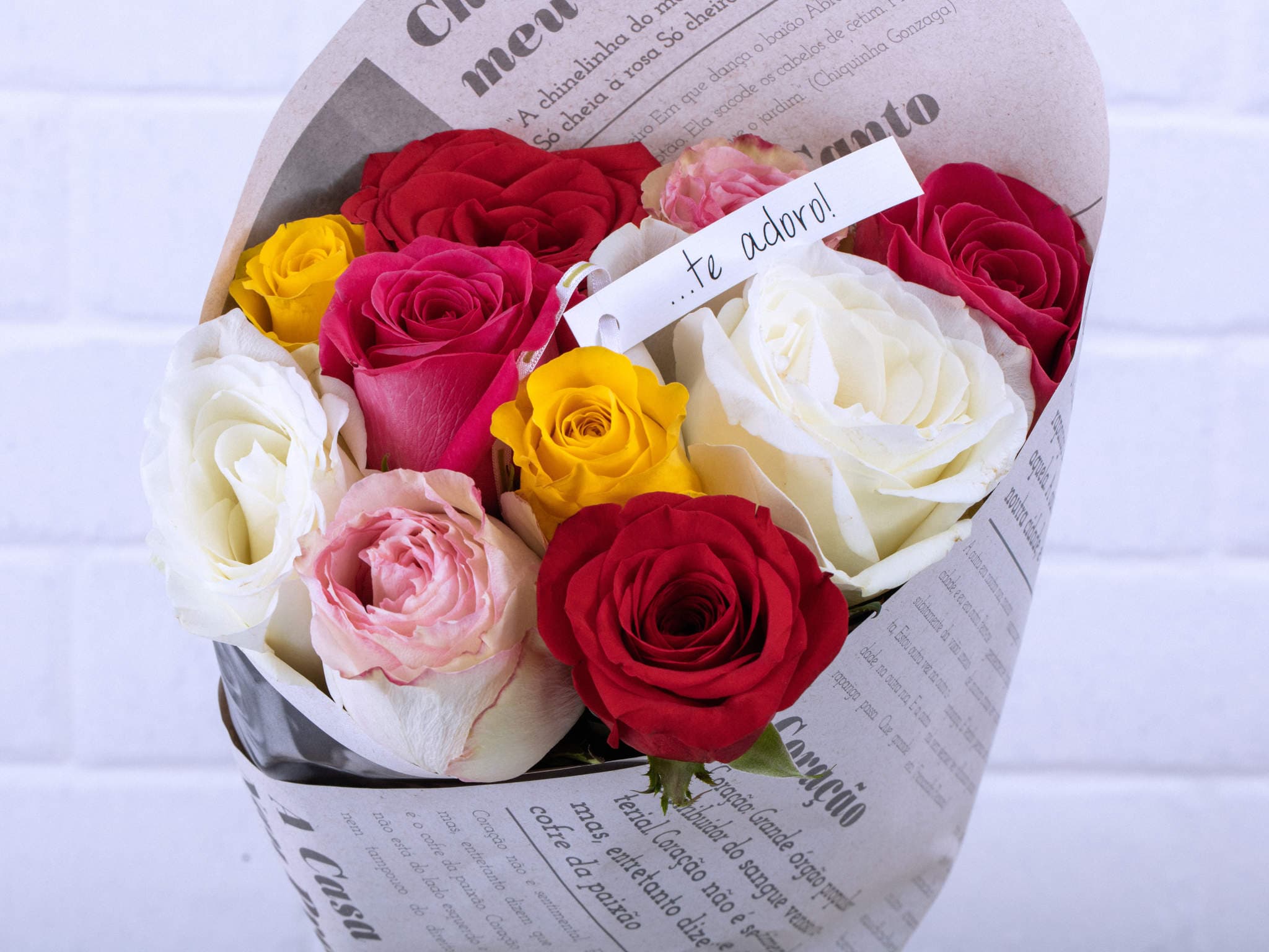 Buquê de 10 Rosas Coloridas Para Entrega. Composição cuidadosamente preparada pela Petalá com flores frescas selecionadas, embalagem premium e cartão personalizado. Entrega expressa para todo o Brasil.