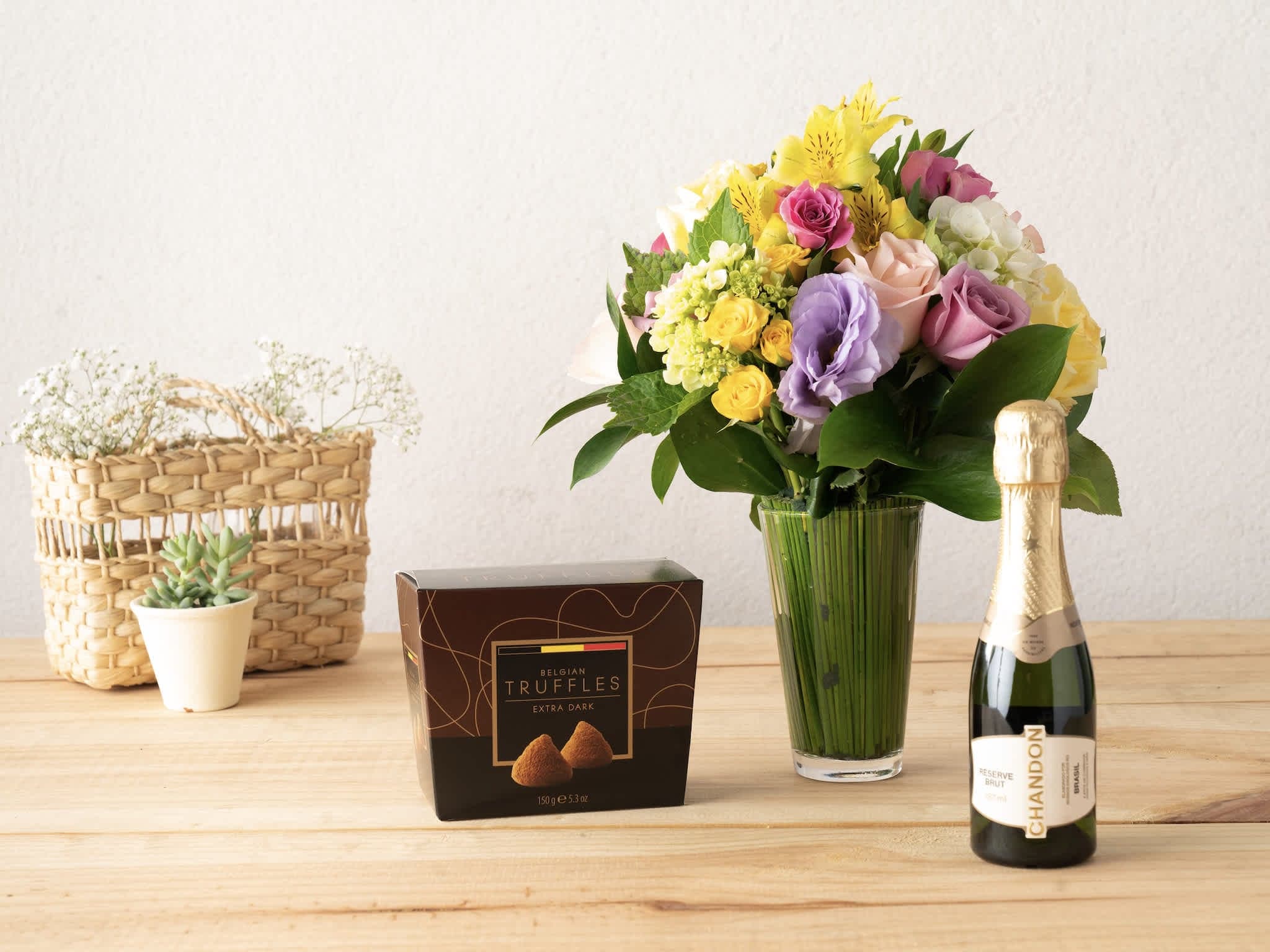 A Florista Médio, Trufas e Baby Chandon Para Entrega. Composição cuidadosamente preparada pela Petalá com flores frescas selecionadas, embalagem premium e cartão personalizado. Entrega expressa para todo o Brasil.