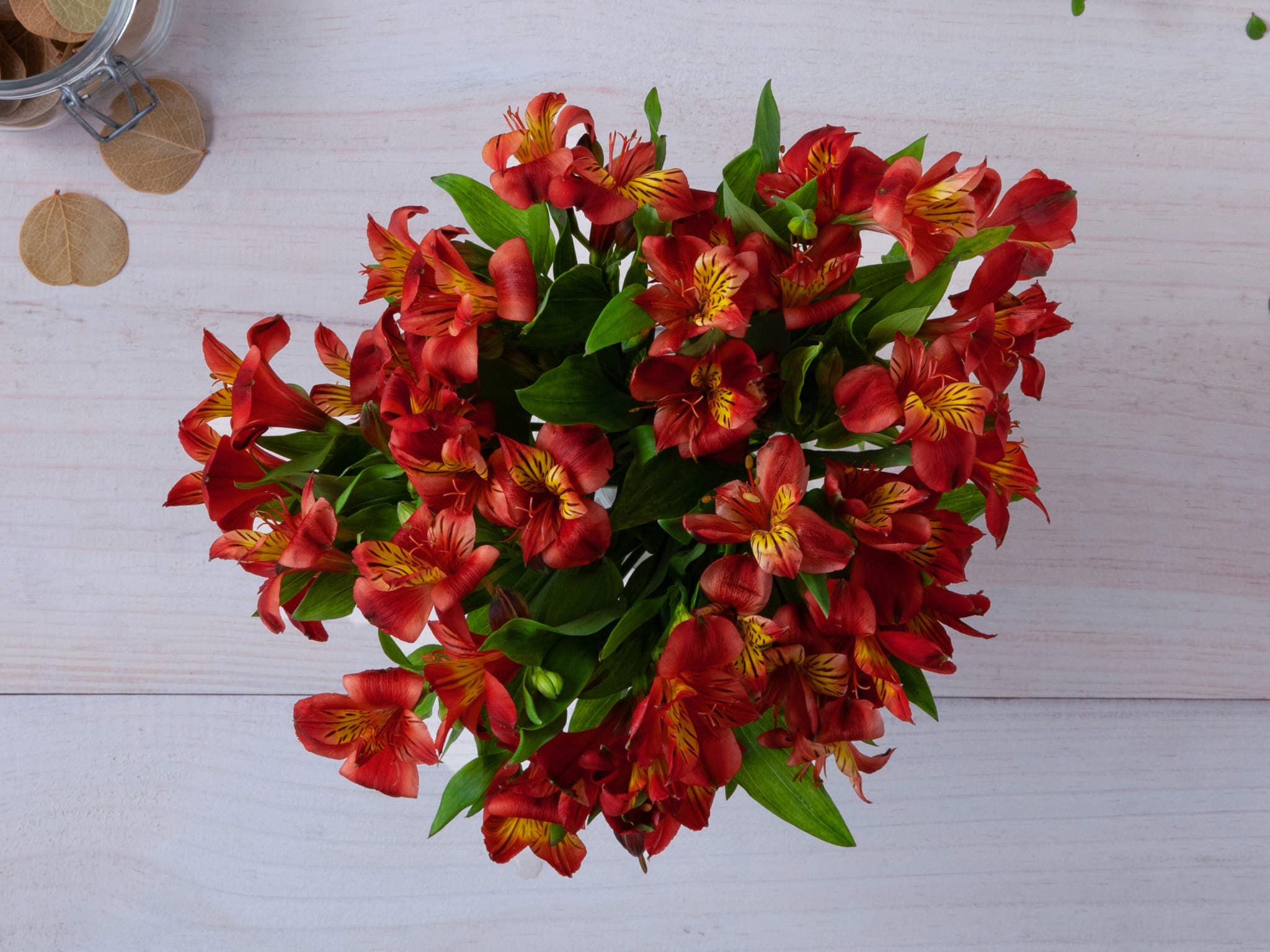 Arranjo de Alstroemérias Vermelhas em Vaso Para Entrega. Composição cuidadosamente preparada pela Petalá com flores frescas selecionadas, embalagem premium e cartão personalizado. Entrega expressa para todo o Brasil.