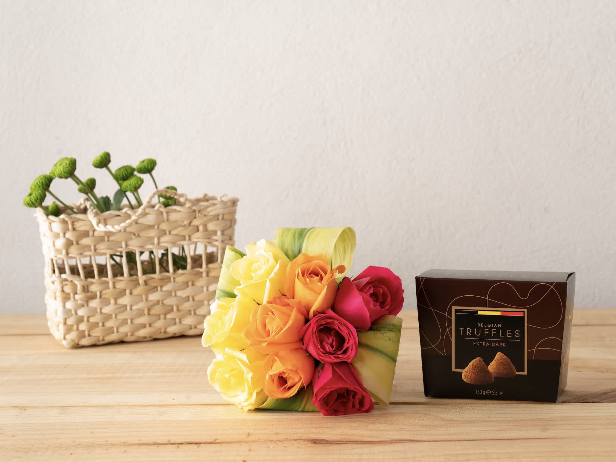 Beleza Colorida e Trufas Belgas Para Entrega. Composição cuidadosamente preparada pela Petalá com flores frescas selecionadas, embalagem premium e cartão personalizado. Entrega expressa para todo o Brasil.