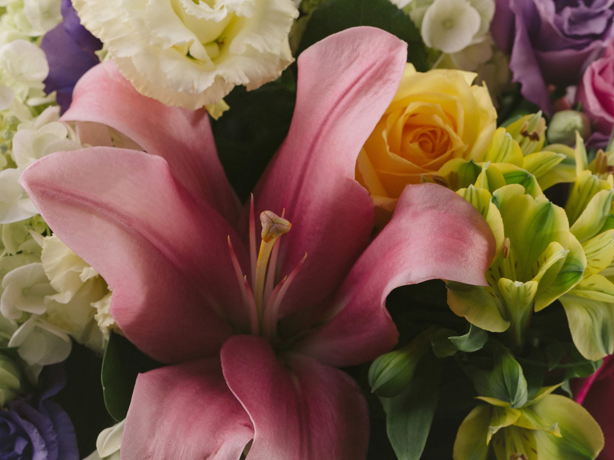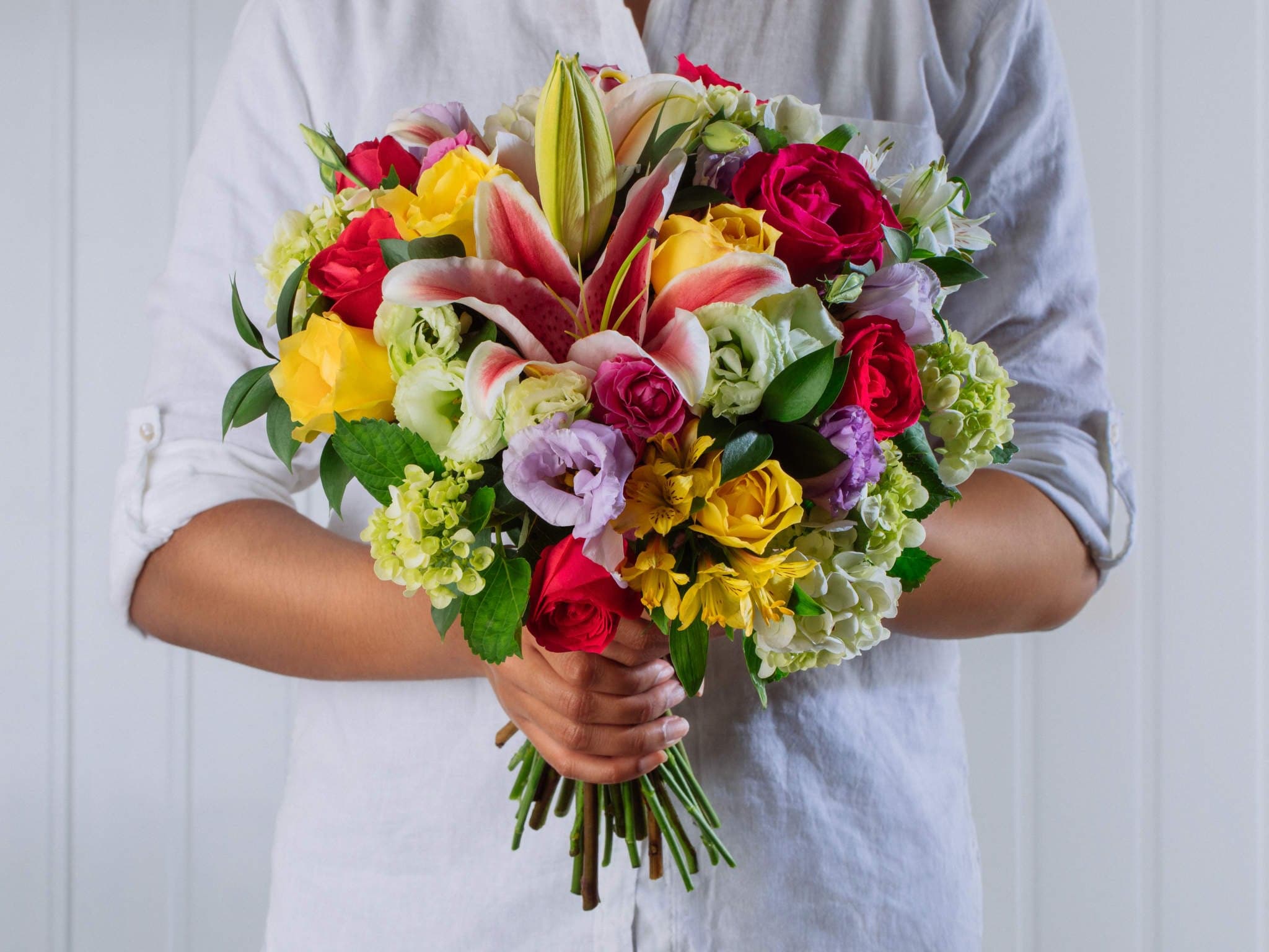 Buquê de Rosas, Lírios, Alstroemérias, Lisianthus e Hortênsias