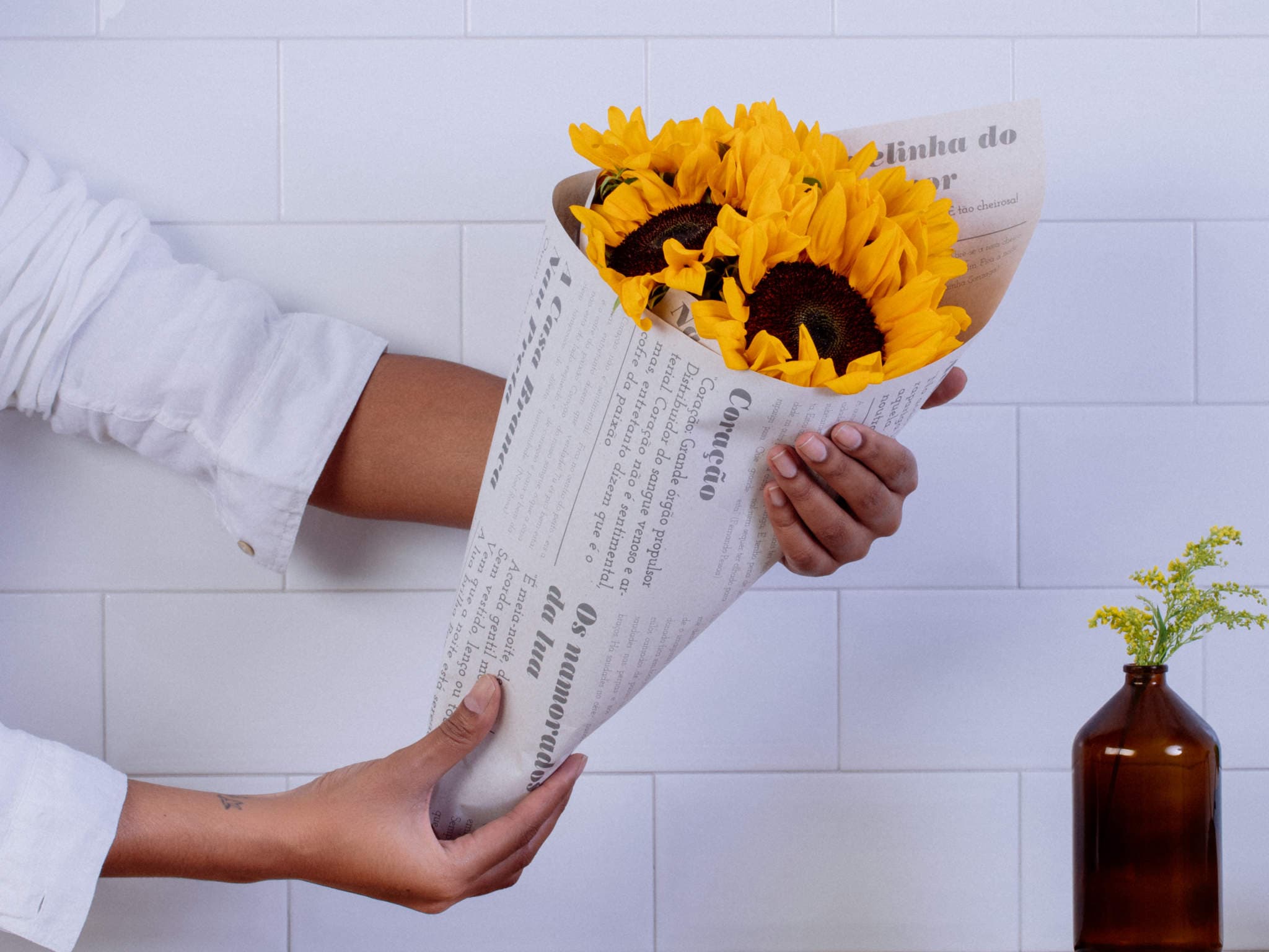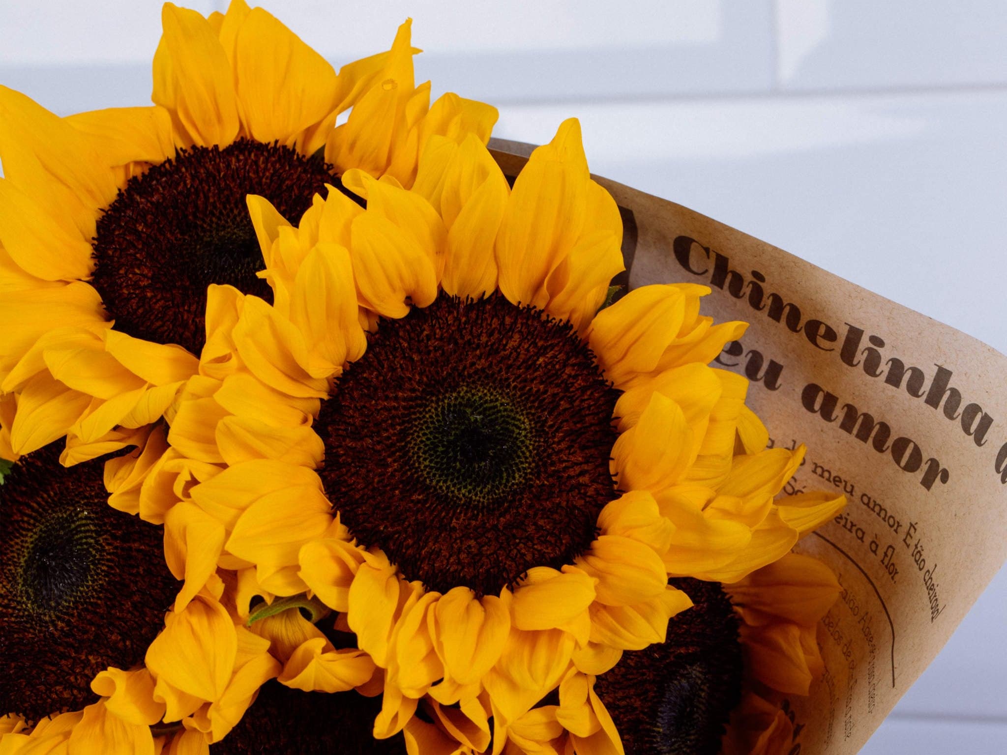 Buquê de Girassóis Enrolado em Jornal Para Entrega. Composição cuidadosamente preparada pela Petalá com flores frescas selecionadas, embalagem premium e cartão personalizado. Entrega expressa para todo o Brasil.