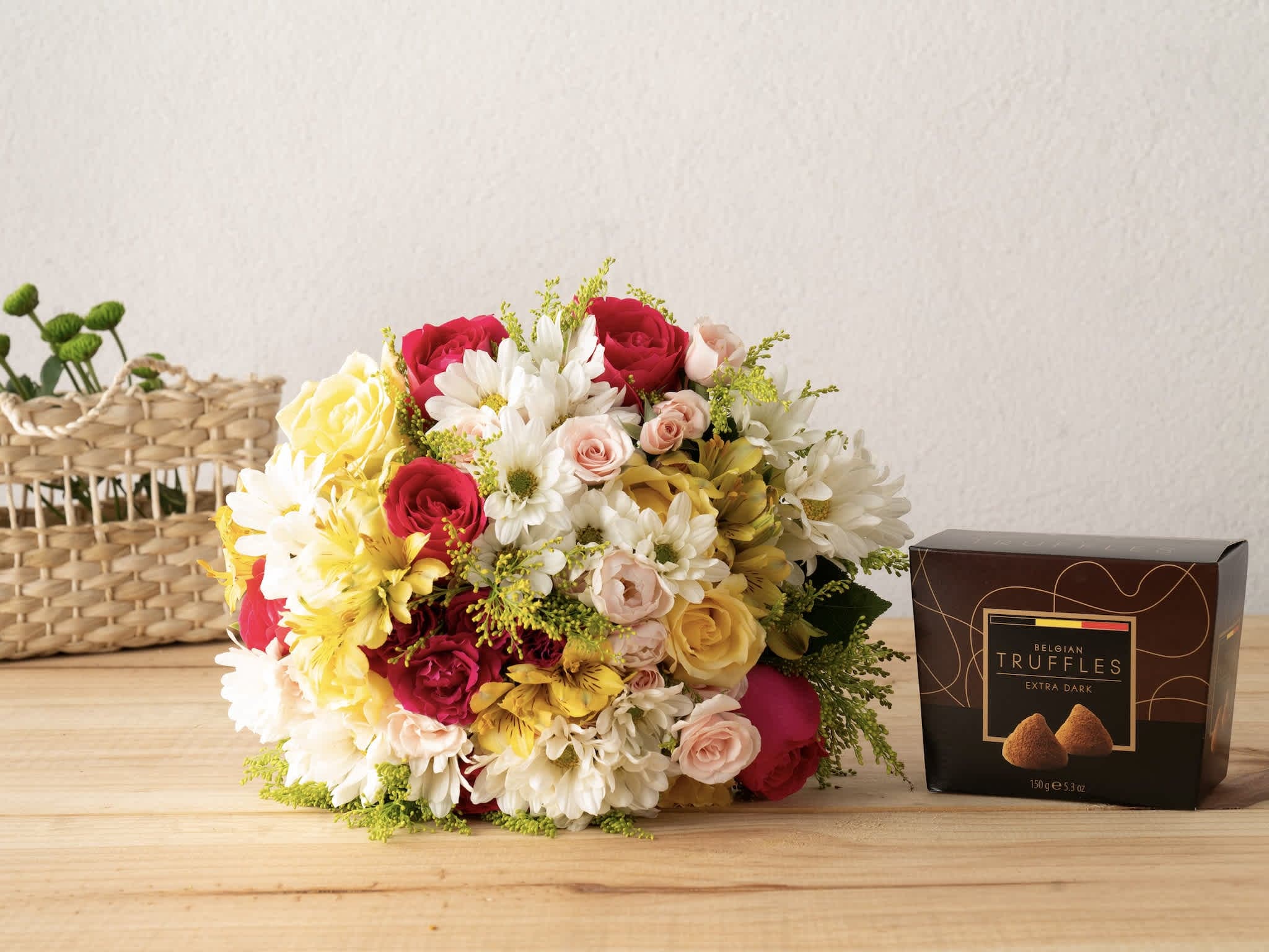 Buquê Primavera e Trufas Belgas Para Entrega. Composição cuidadosamente preparada pela Petalá com flores frescas selecionadas, embalagem premium e cartão personalizado. Entrega expressa para todo o Brasil.