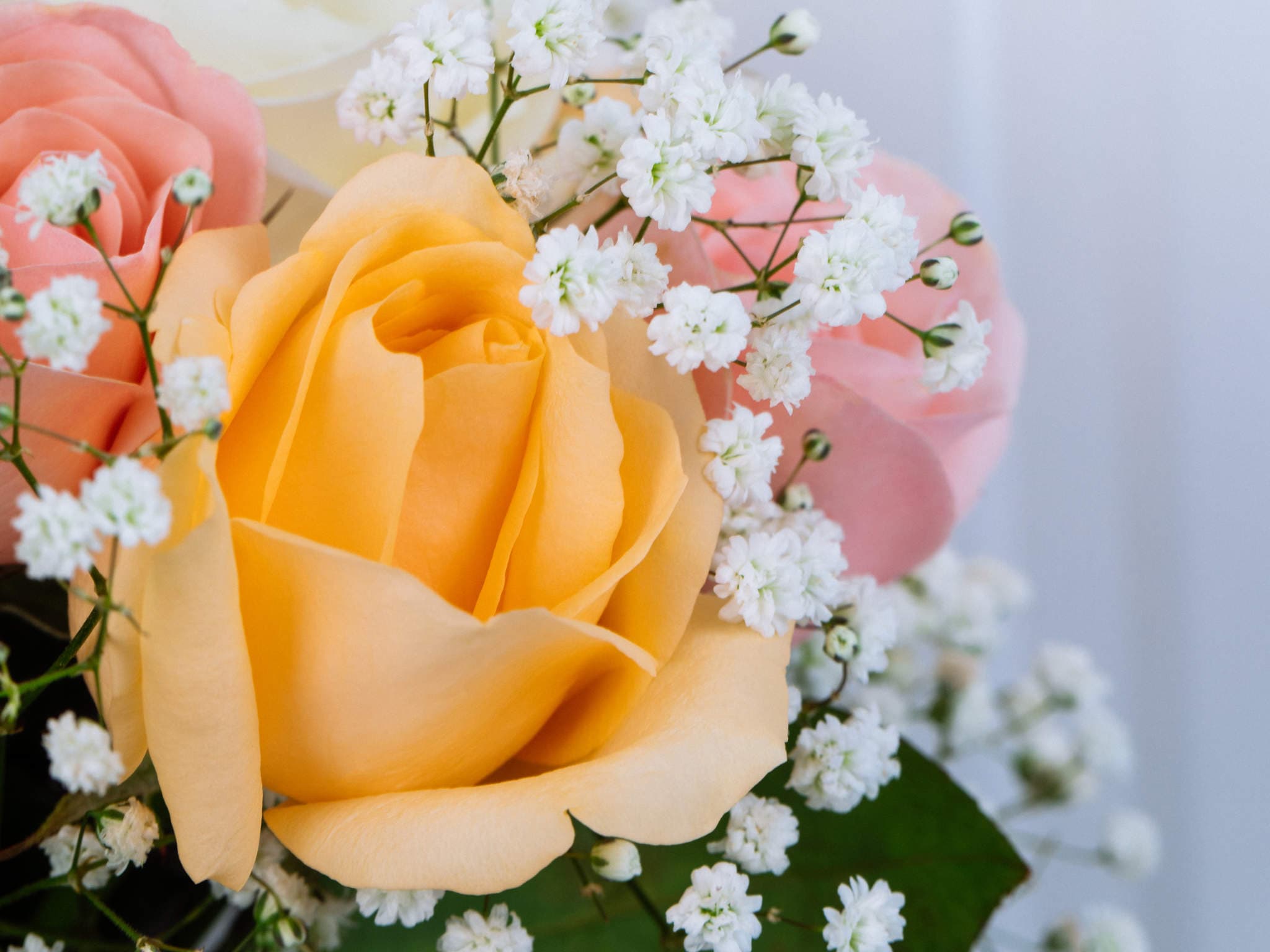 Buquê de Rosas Brancas, Salmão e Rosa com Gypsophila