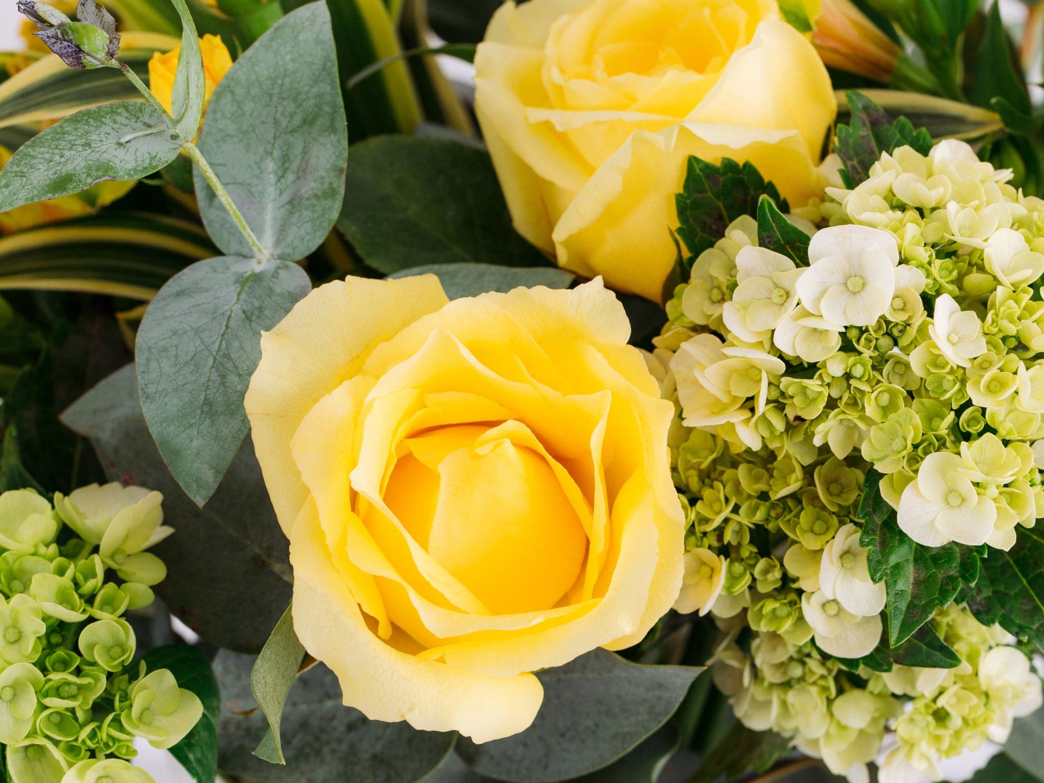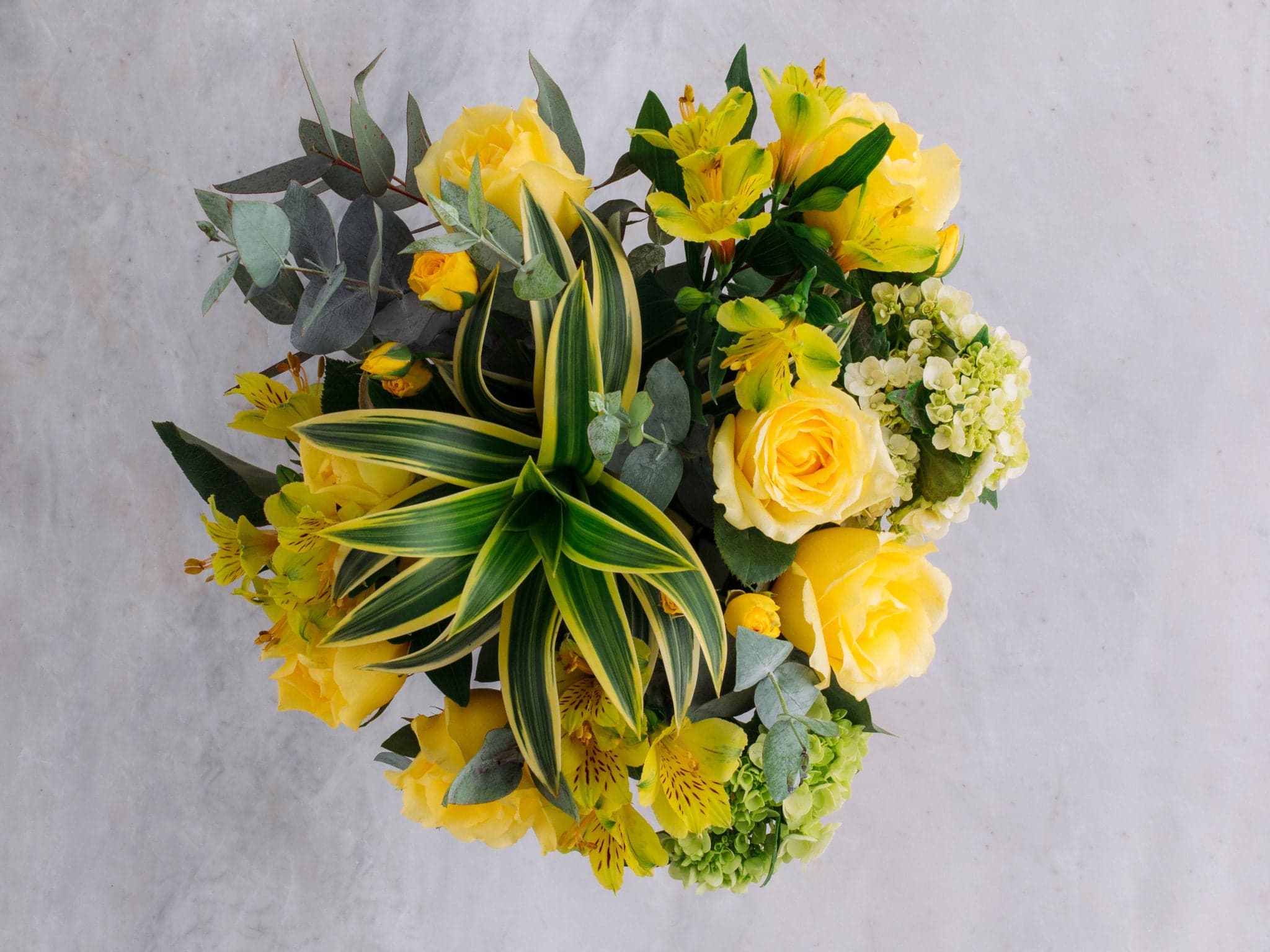 Arranjo de Rosas e Alstroemérias Amarelas e Hortênsias em Vaso.... Composição cuidadosamente preparada pela Petalá com flores frescas selecionadas, embalagem premium e cartão personalizado. Entrega expressa para todo o Brasil.