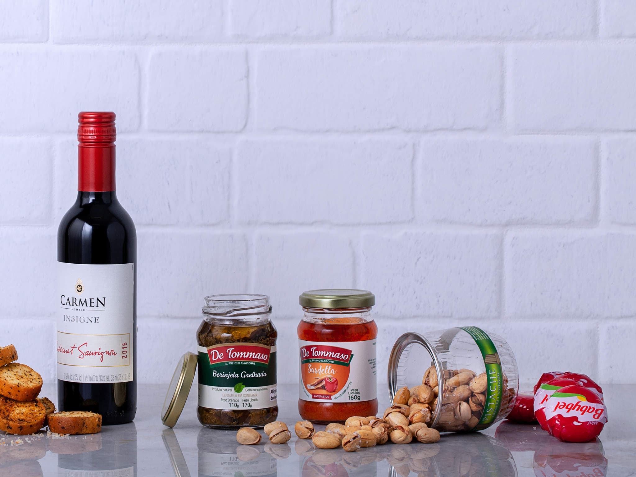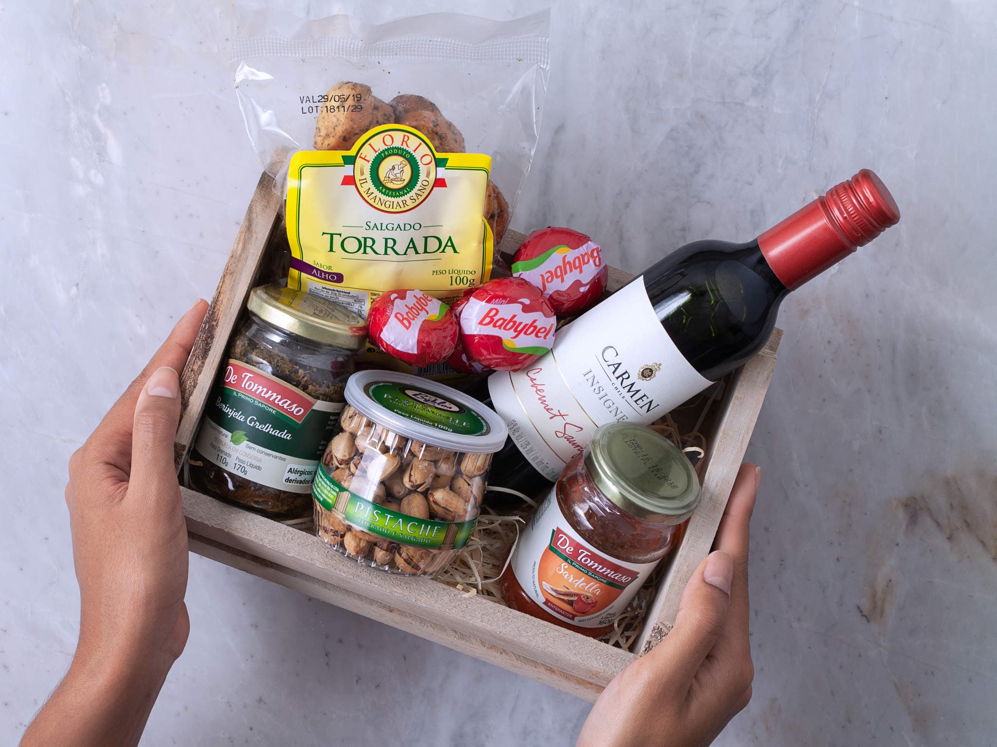 Cesta de Presente com Vinho, Queijo e Guloseimas Para Entrega