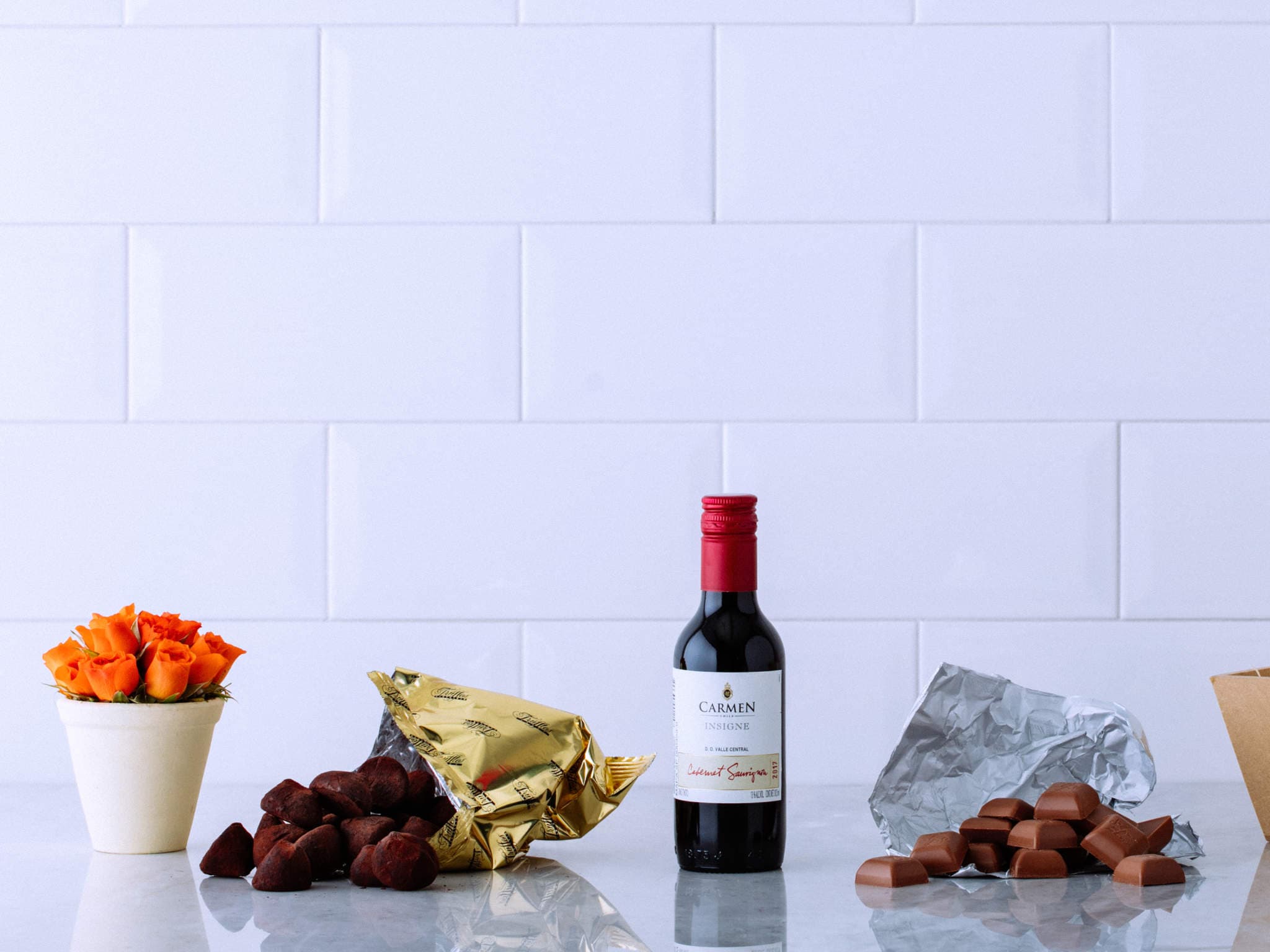Cesta com Vinho, Rosas Laranja, Chocolate e Trufas. Composição cuidadosamente preparada pela Petalá com flores frescas selecionadas, embalagem premium e cartão personalizado. Entrega expressa para todo o Brasil.