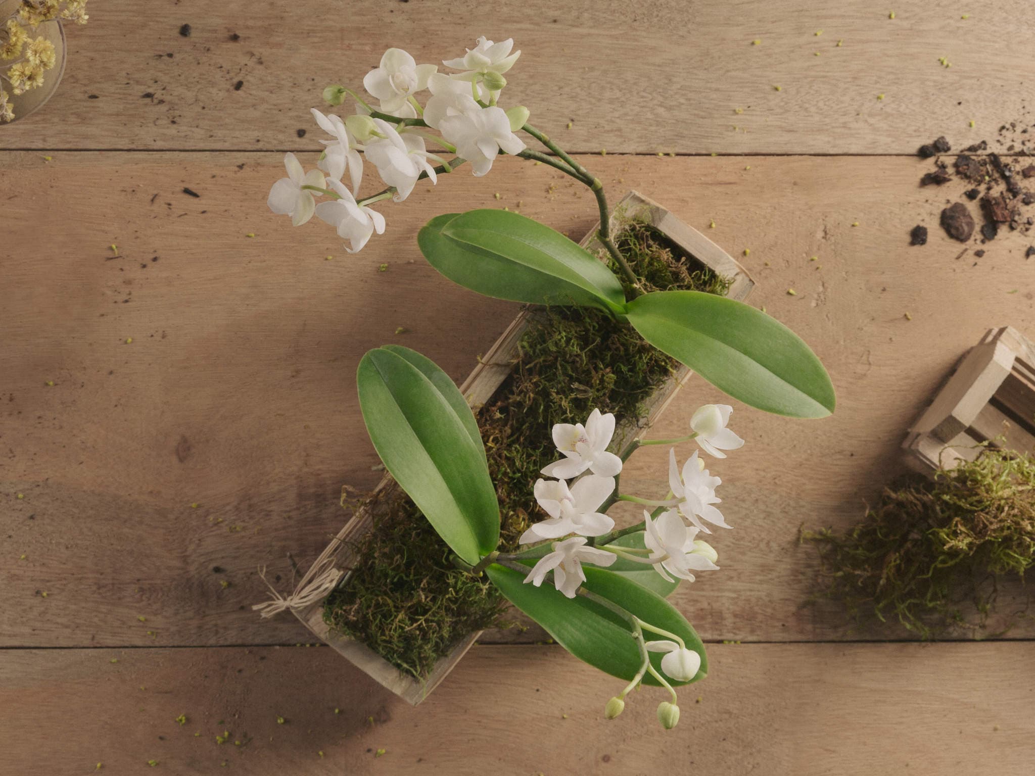 Mini Orquídeas Brancas em Base Rústica de Madeira