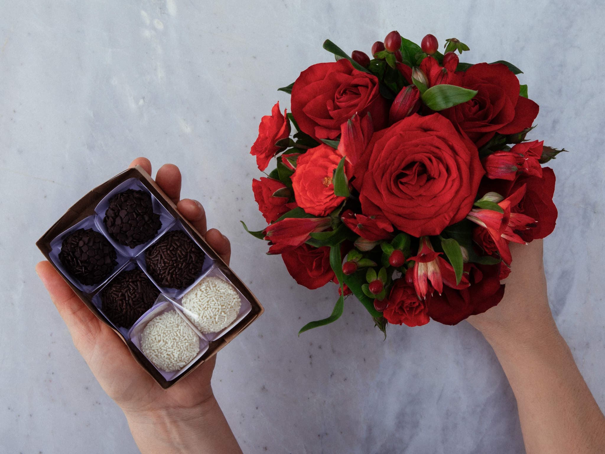 Arranjo de Rosas e Alstroemérias Vermelhas com Brigadeiros Bri...