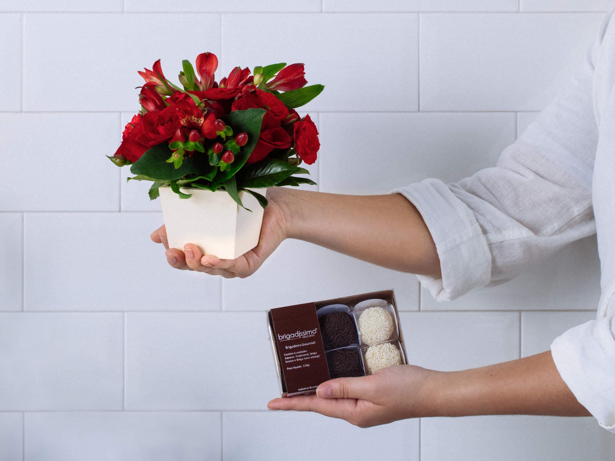 Arranjo de Rosas e Alstroemérias Vermelhas com Brigadeiros Brigadíssimo