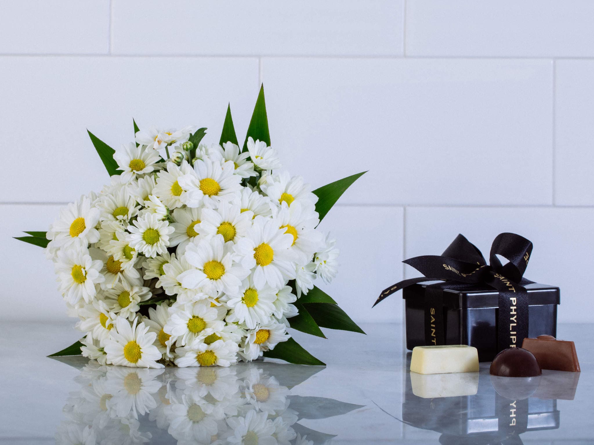 Buquê de Margaridas com Caixa de Bombom Para Entrega. Composição cuidadosamente preparada pela Petalá com flores frescas selecionadas, embalagem premium e cartão personalizado. Entrega expressa para todo o Brasil.