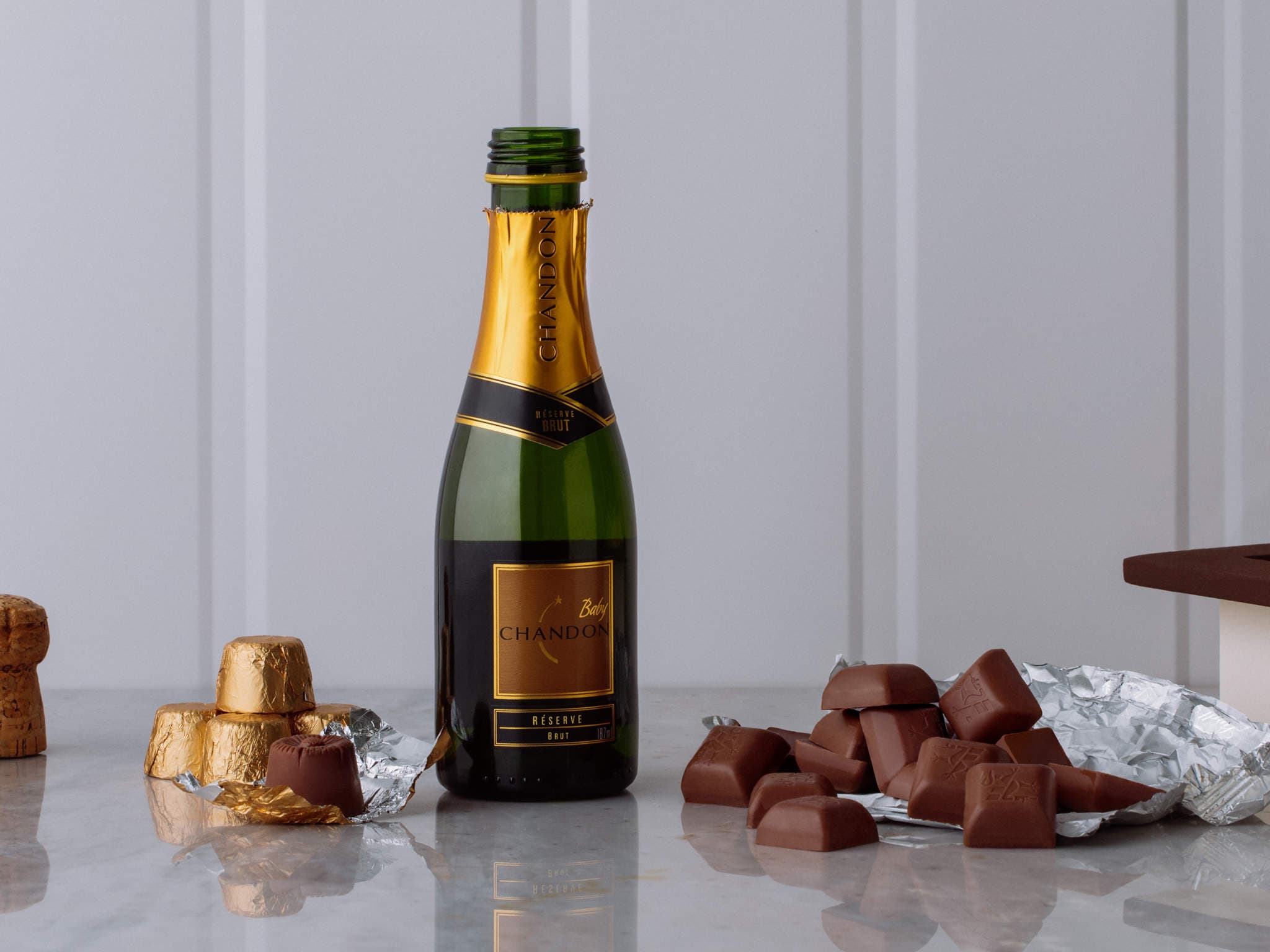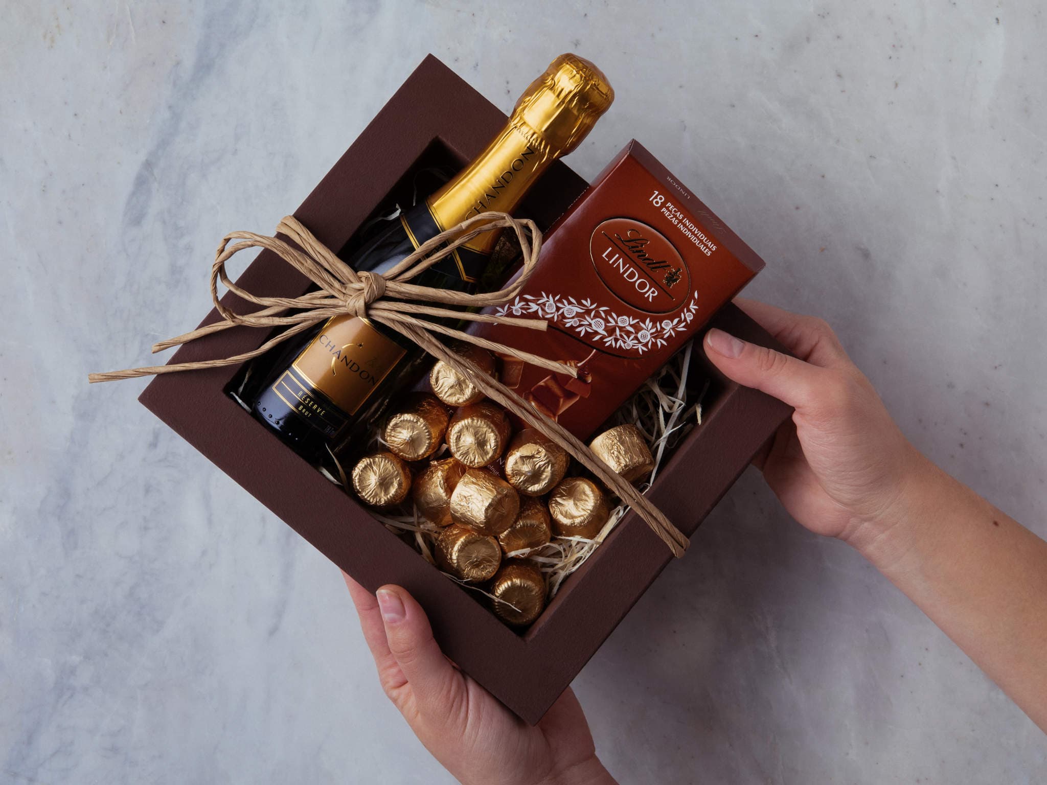 Cesta de Presente com Chocolates e Espumante Chandon. Composição cuidadosamente preparada pela Petalá com flores frescas selecionadas, embalagem premium e cartão personalizado. Entrega expressa para todo o Brasil.