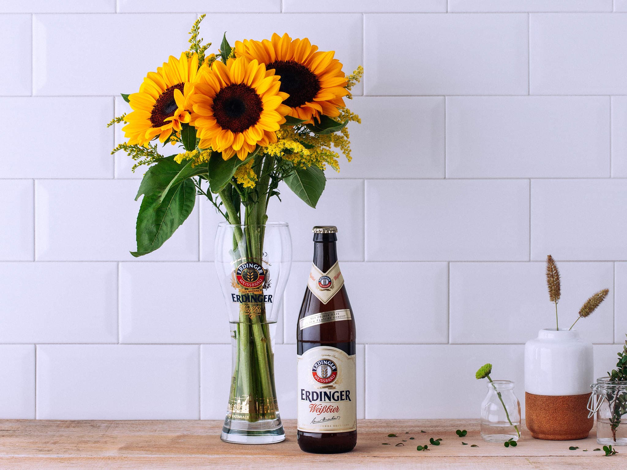 Cesta com Cerveja Erdinger e Copo e Girassol Para Entrega. Composição cuidadosamente preparada pela Petalá com flores frescas selecionadas, embalagem premium e cartão personalizado. Entrega expressa para todo o Brasil.