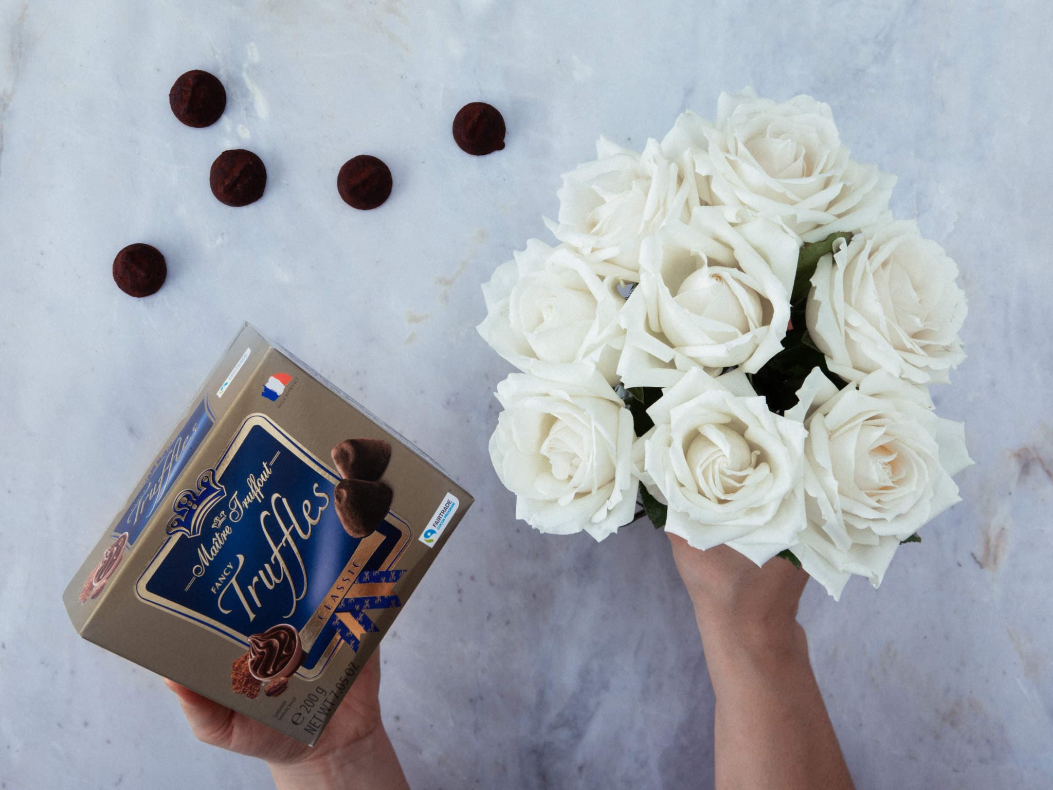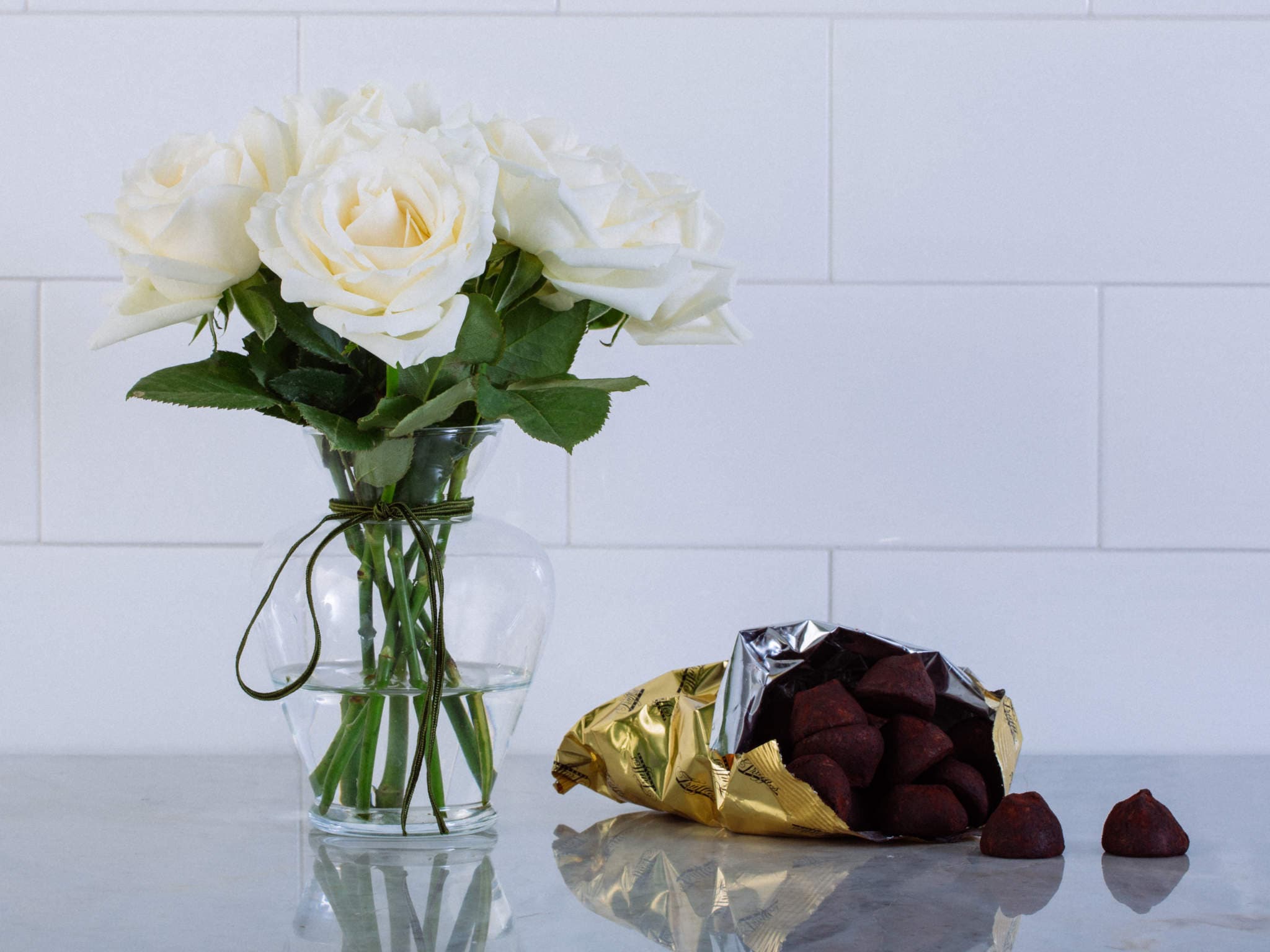 Arranjo de Rosas Brancas em Vaso com Trufas Francesas Jacquot