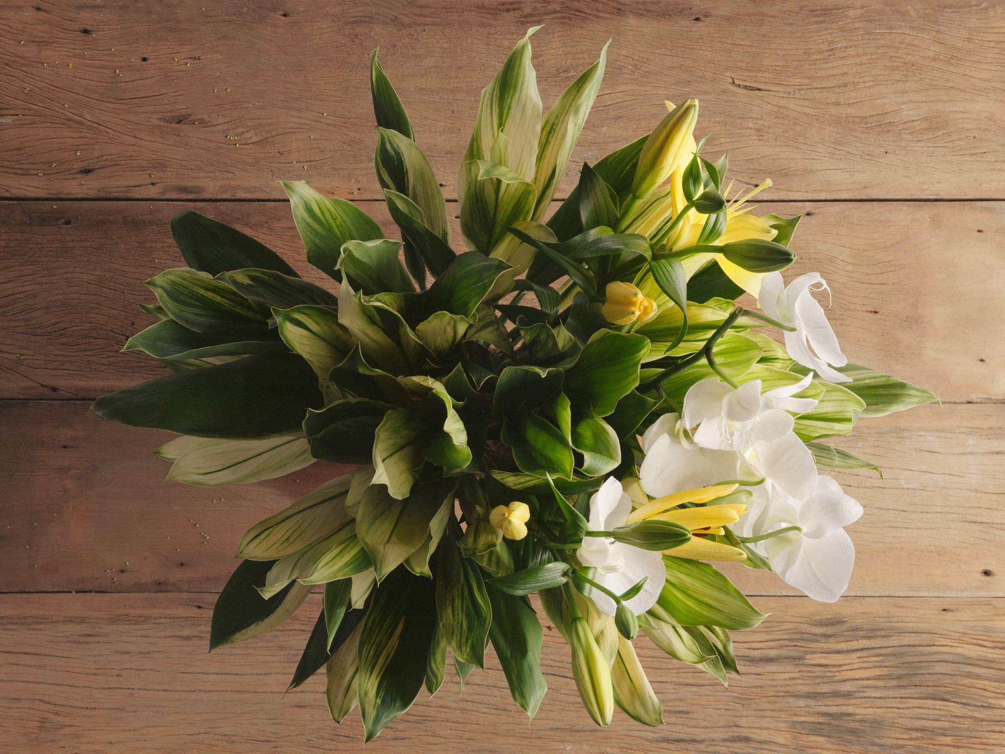 Arranjo de Flores com Orquídeas Brancas e Lírios Amarelos em V.... Composição cuidadosamente preparada pela Petalá com flores frescas selecionadas, embalagem premium e cartão personalizado. Entrega expressa para todo o Brasil.