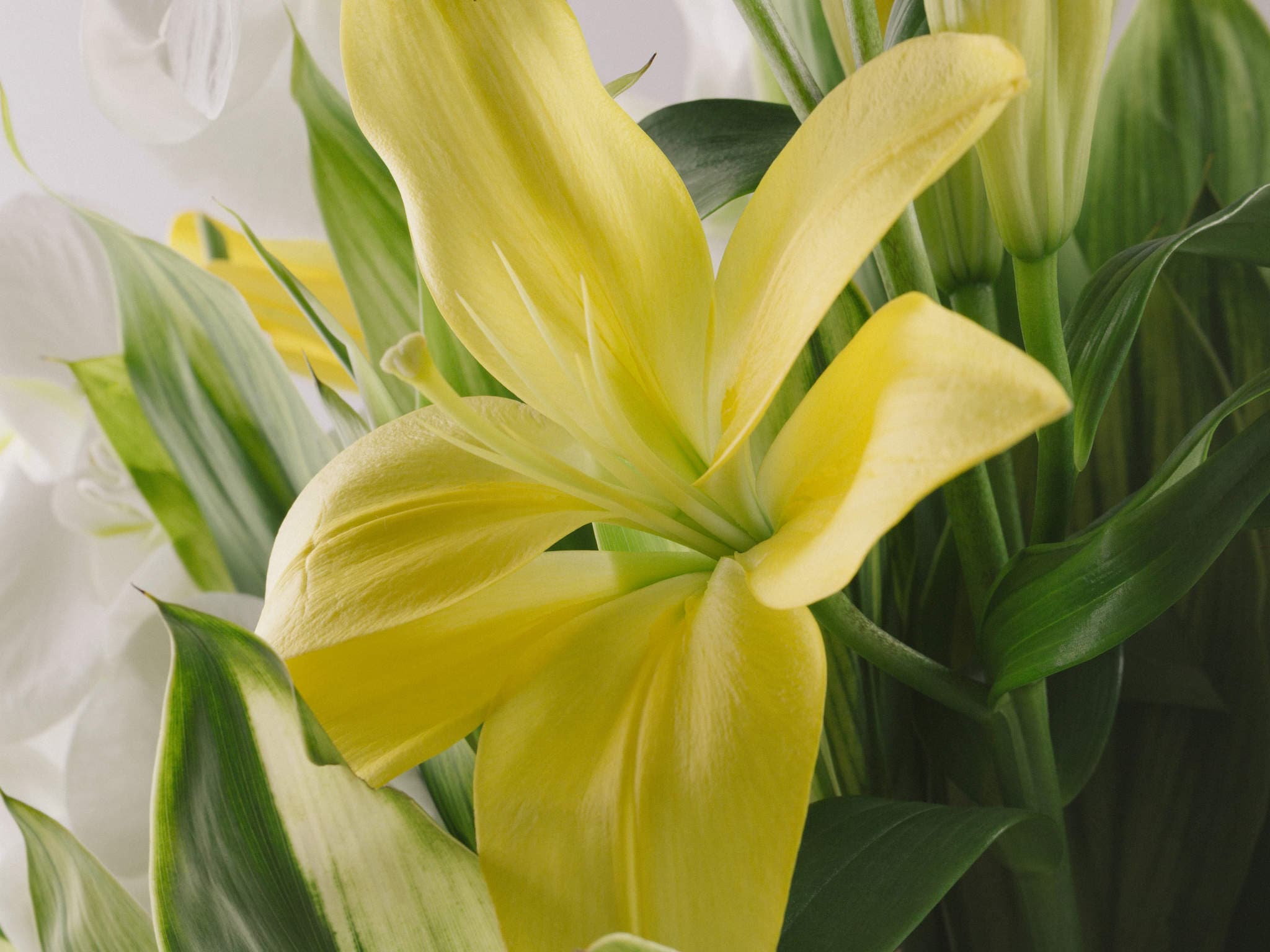 Arranjo de Flores com Orquídeas Brancas e Lírios Amarelos em V...