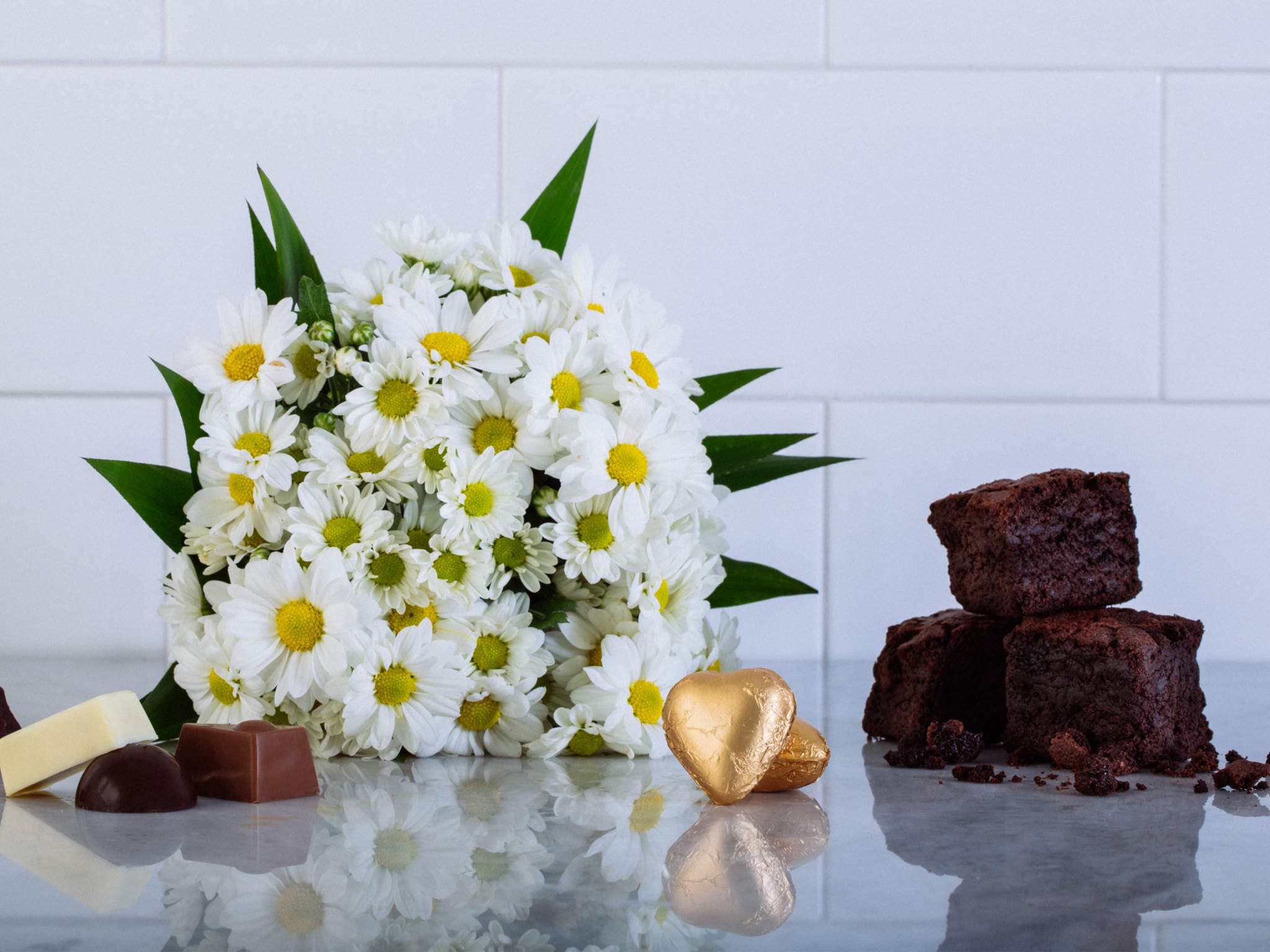 Cesta de Presente com Buquê de Margaridas e Chocolate. Composição cuidadosamente preparada pela Petalá com flores frescas selecionadas, embalagem premium e cartão personalizado. Entrega expressa para todo o Brasil.