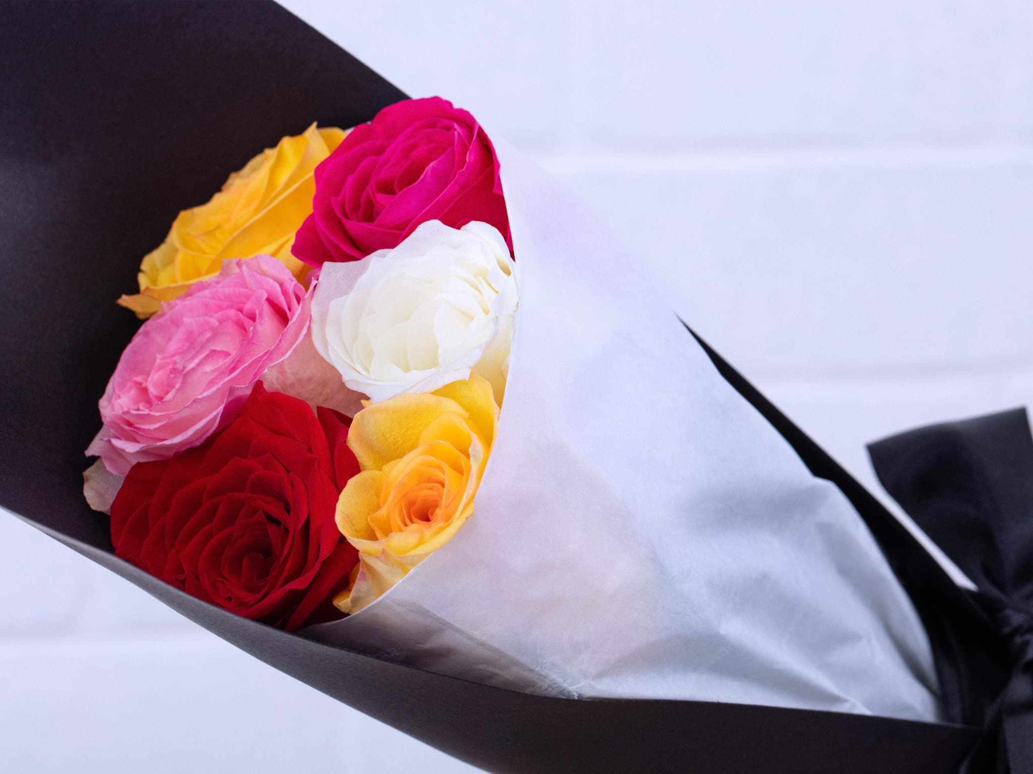 Buquê de 6 Rosas Coloridas Para Entrega. Composição cuidadosamente preparada pela Petalá com flores frescas selecionadas, embalagem premium e cartão personalizado. Entrega expressa para todo o Brasil.