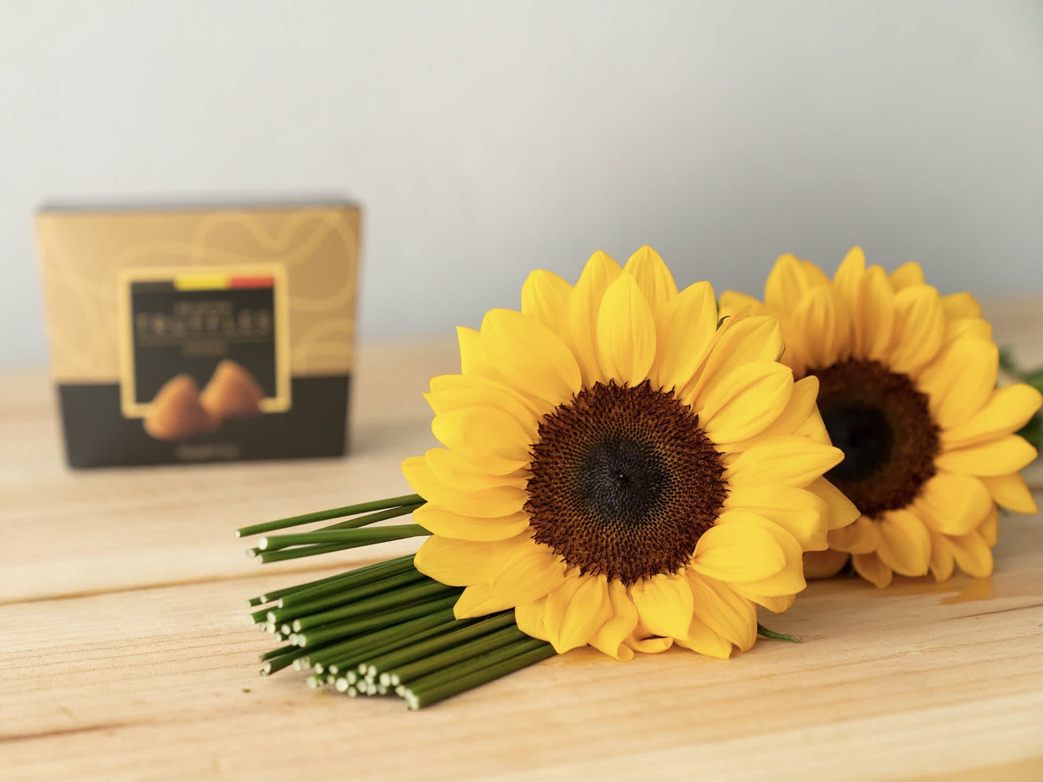 Girassóis e Trufas Belgas Para Entrega. Composição cuidadosamente preparada pela Petalá com flores frescas selecionadas, embalagem premium e cartão personalizado. Entrega expressa para todo o Brasil.