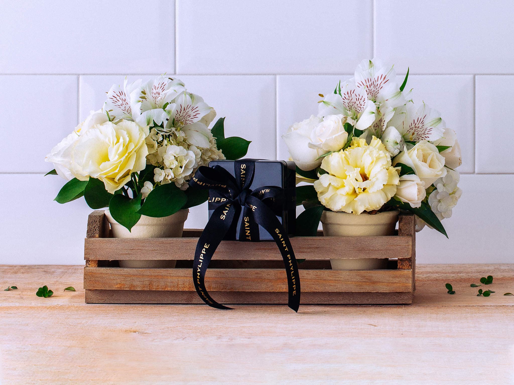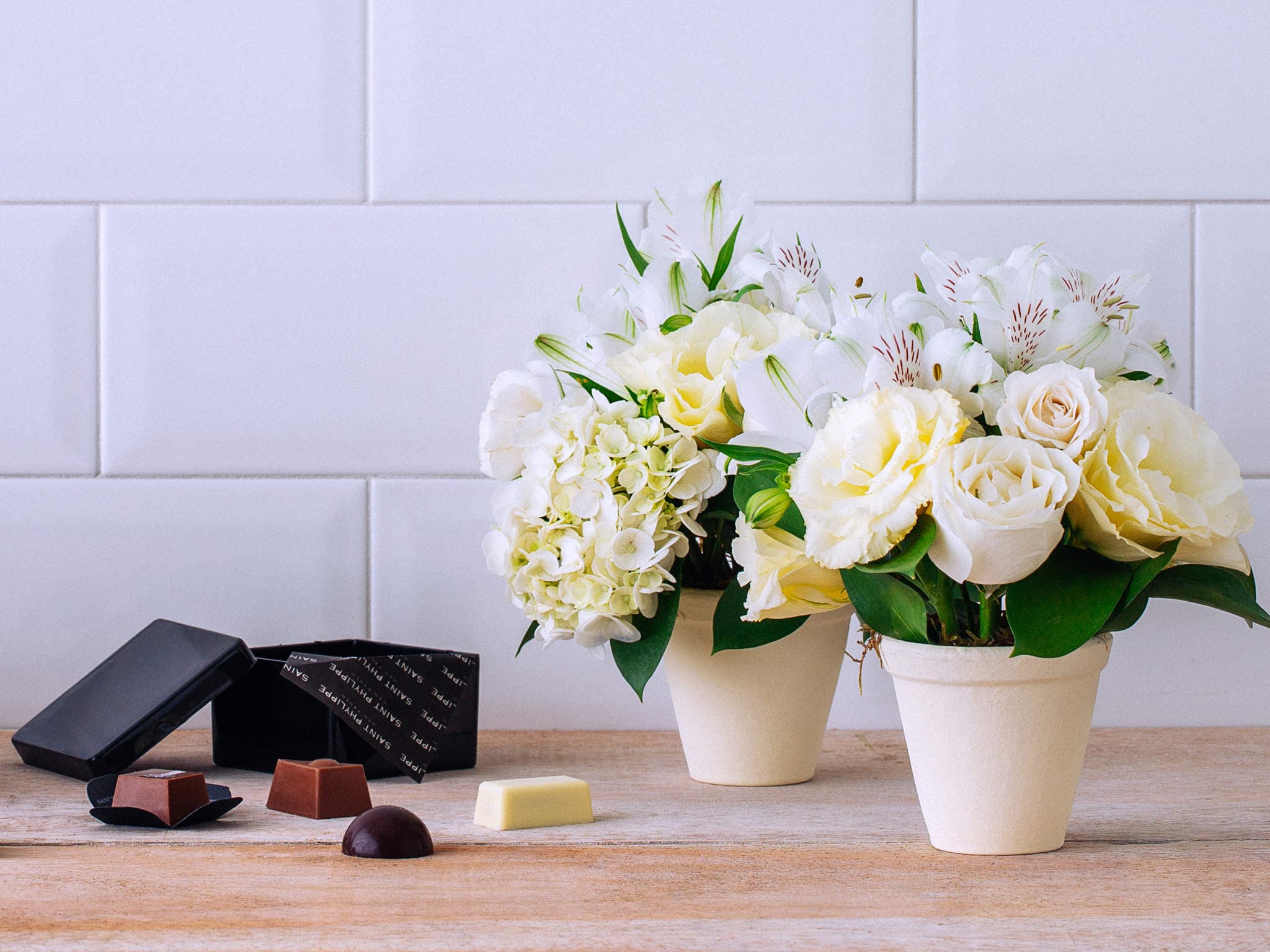 Caixa com Dois Arranjos de Flores Brancas em Vaso com Chocolate. Composição cuidadosamente preparada pela Petalá com flores frescas selecionadas, embalagem premium e cartão personalizado. Entrega expressa para todo o Brasil.