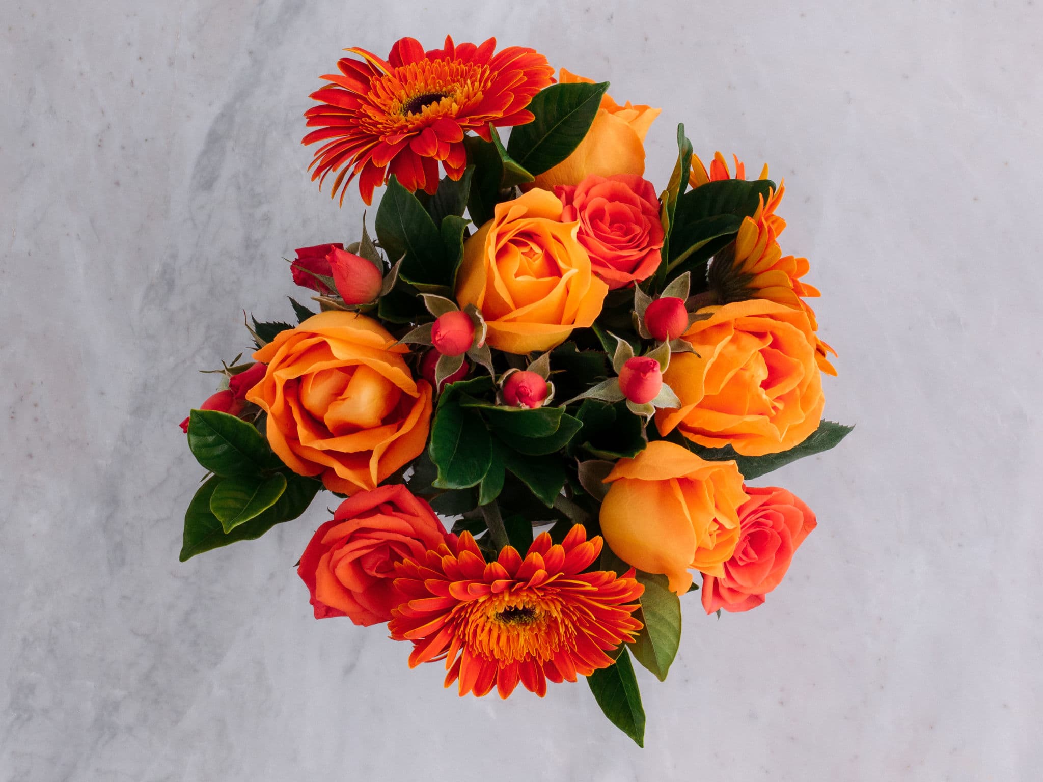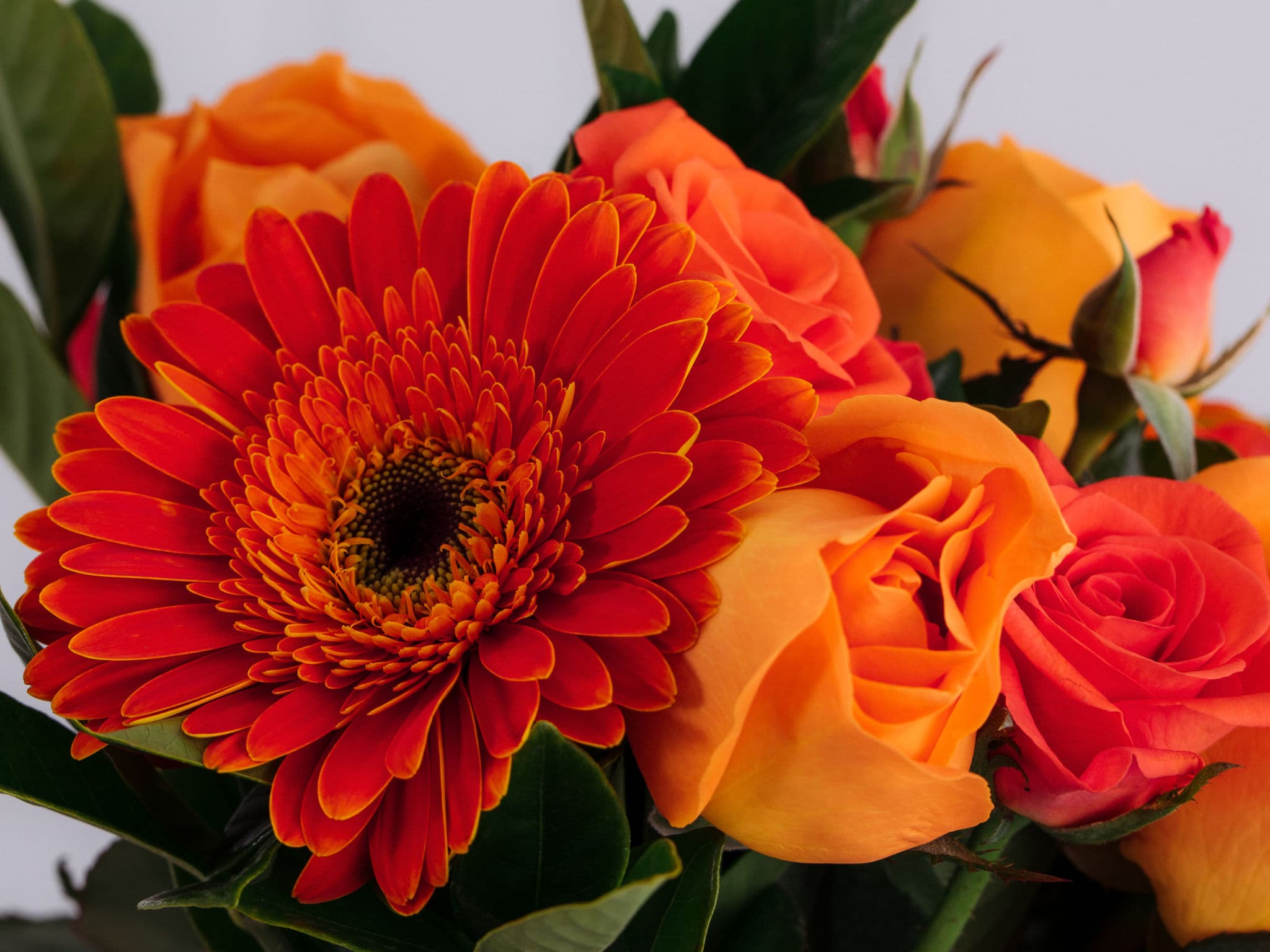Arranjo de Rosas e Gérberas Laranjas em Vaso com Folhagens