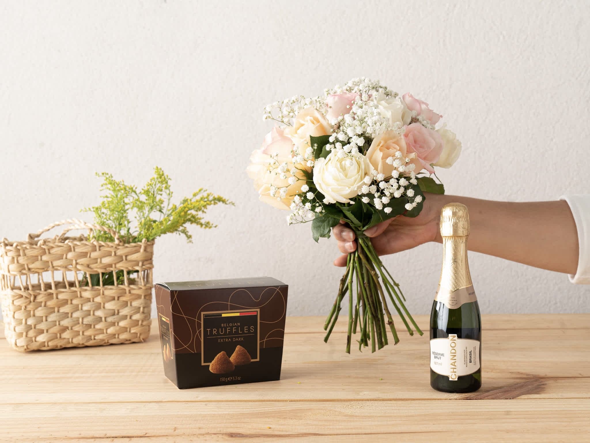 Le Vintage, Trufas e Baby Chandon Para Entrega. Composição cuidadosamente preparada pela Petalá com flores frescas selecionadas, embalagem premium e cartão personalizado. Entrega expressa para todo o Brasil.