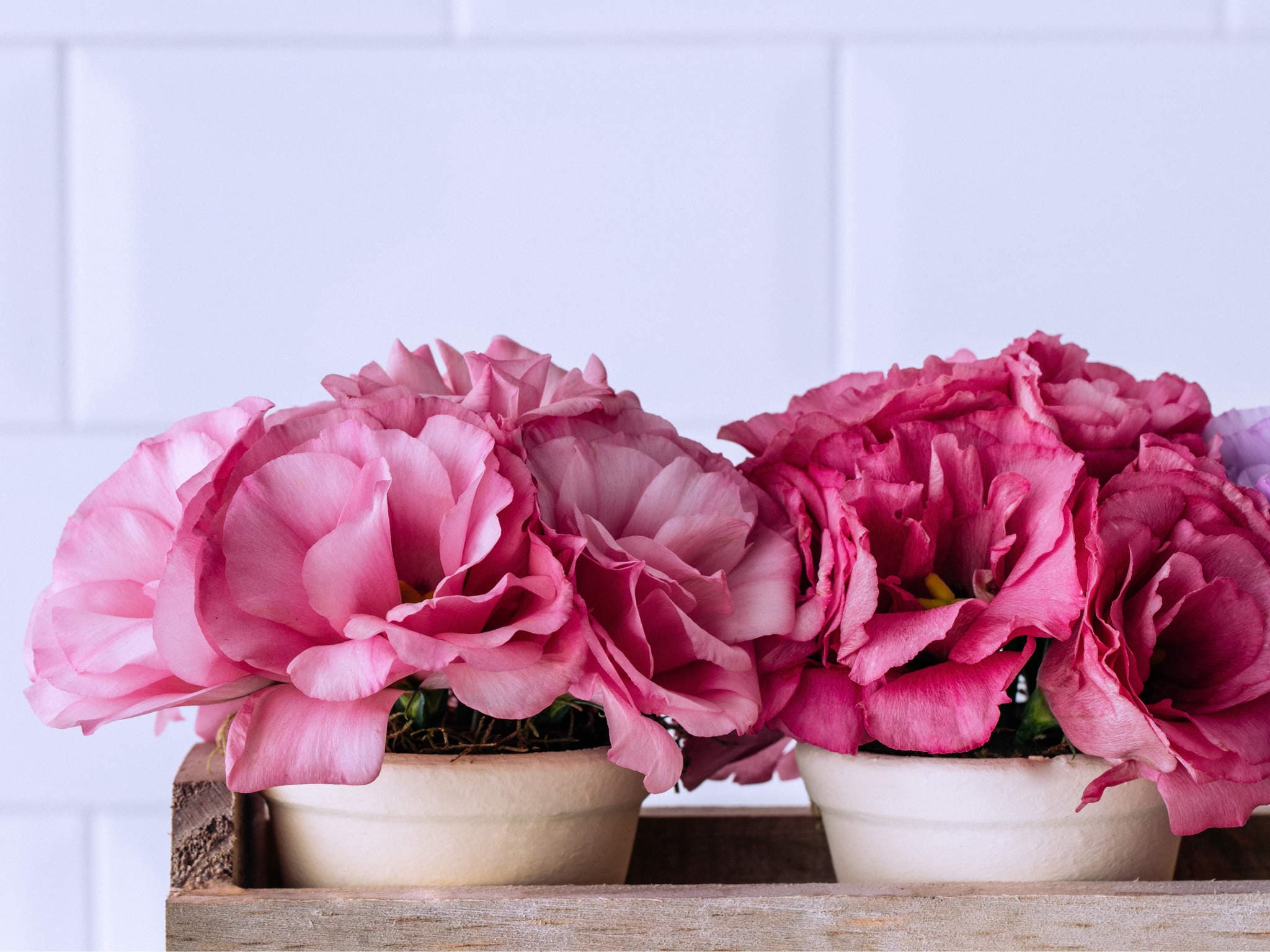 Vasos de Lisianthus Lilás, Roxo e Rosa em Caixa de Madeira. Composição cuidadosamente preparada pela Petalá com flores frescas selecionadas, embalagem premium e cartão personalizado. Entrega expressa para todo o Brasil.