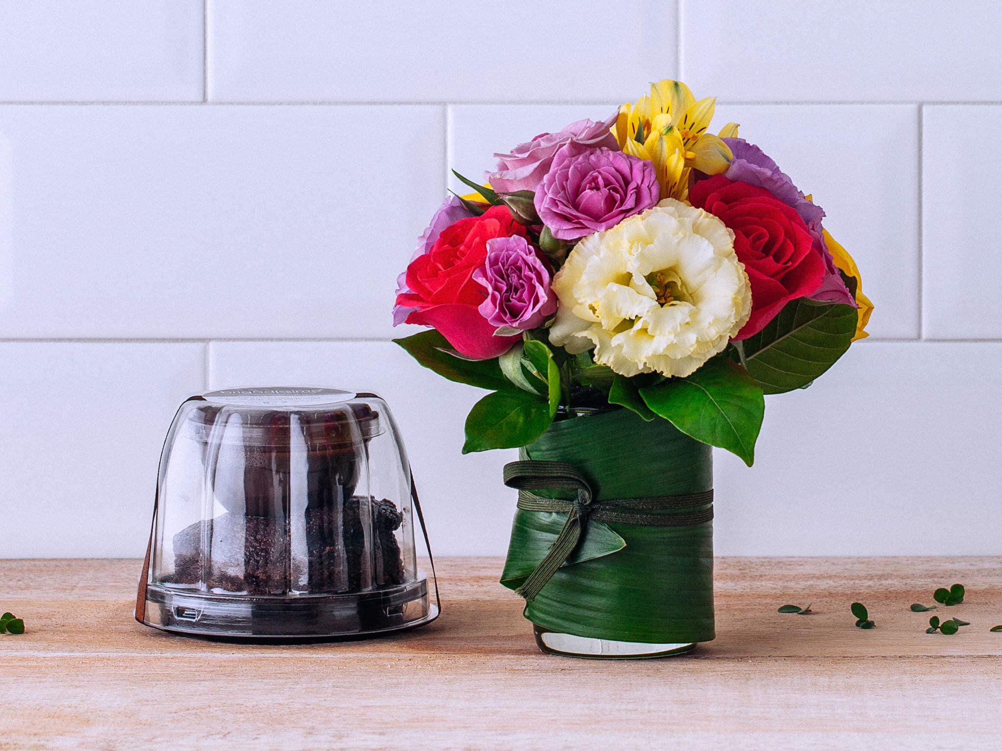 Arranjo de Flores Coloridas em Vaso e Bolo de Chocolate