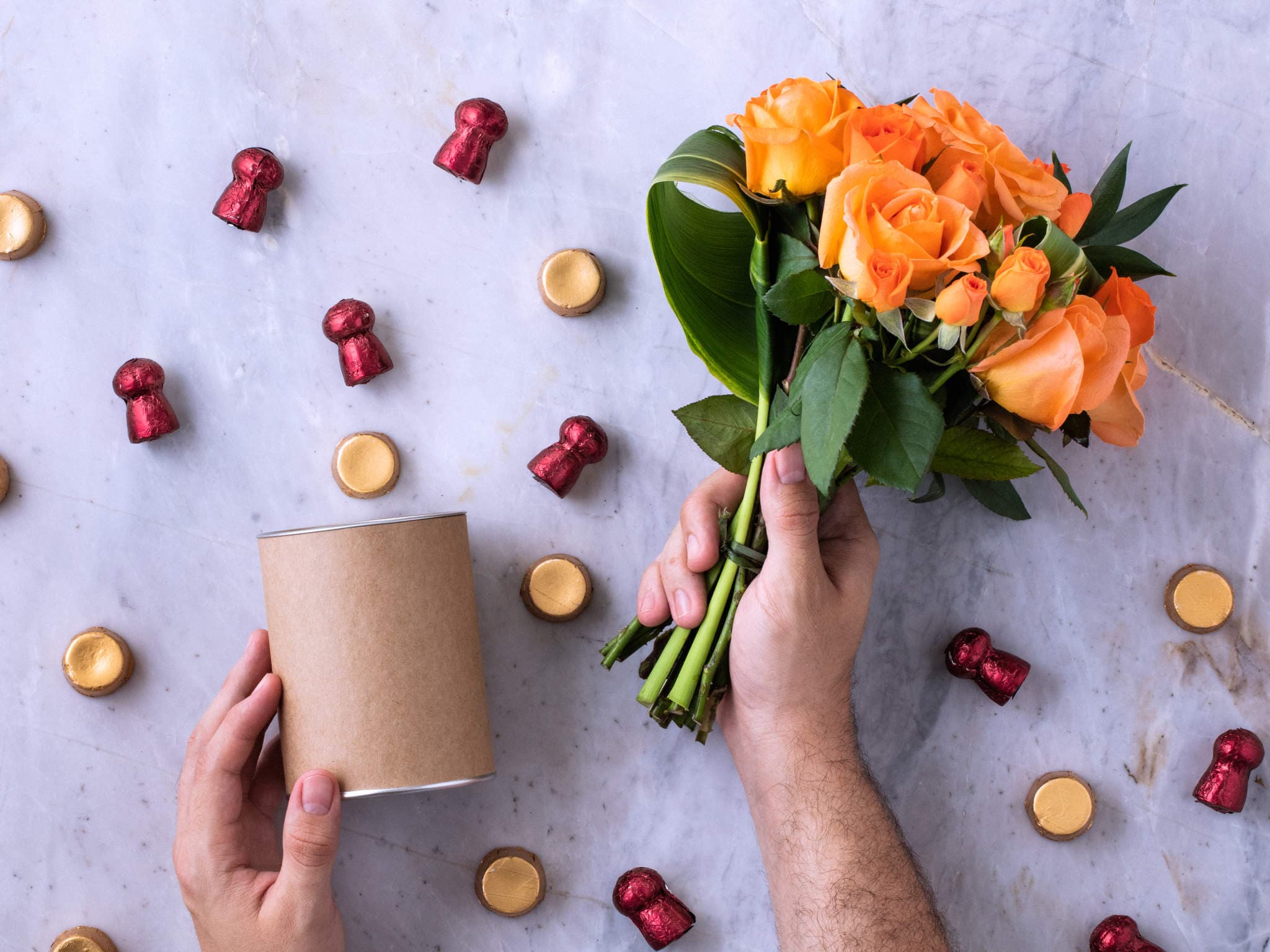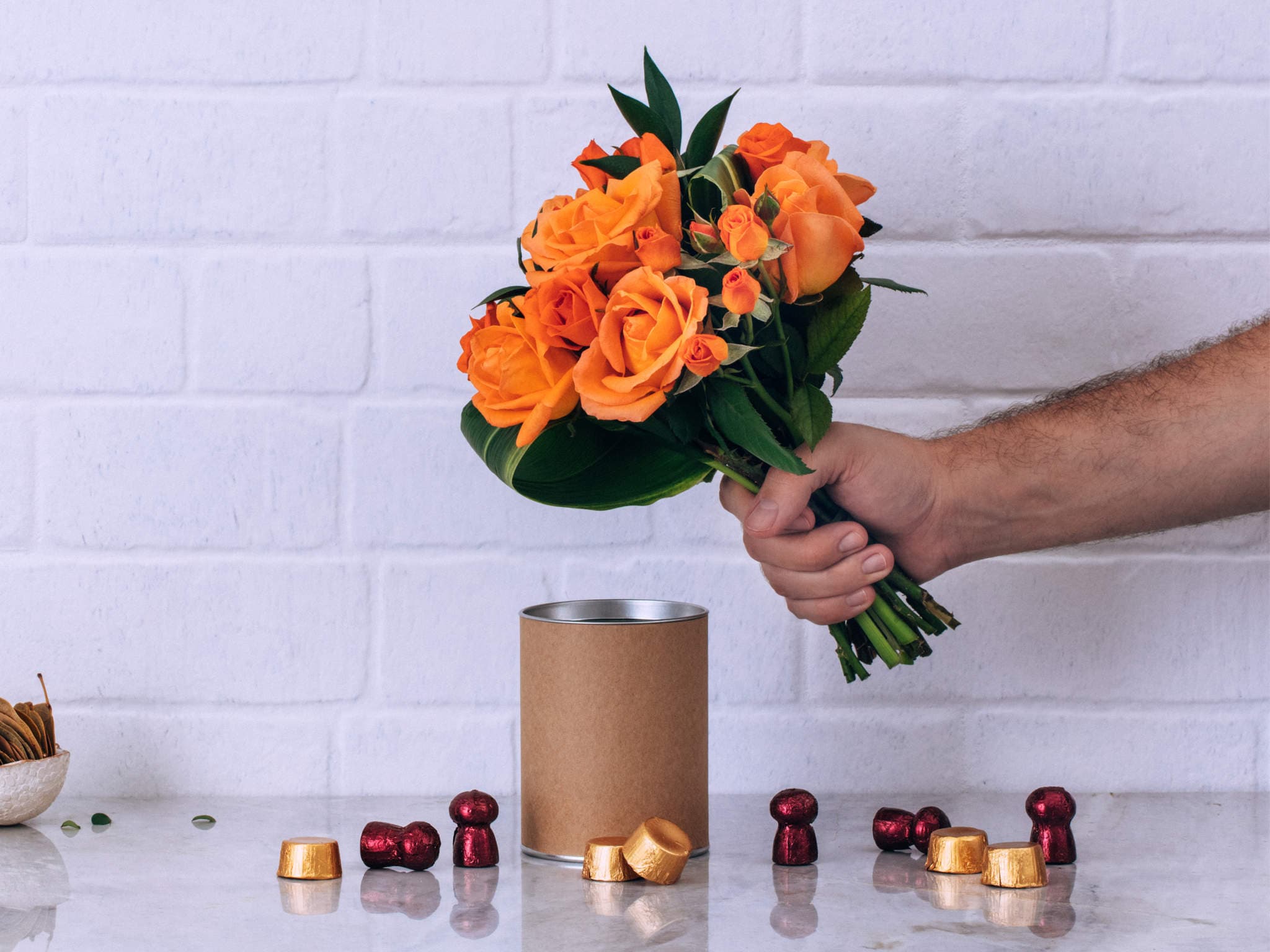 Buquê de Rosas Laranjas e Chocolate. Composição cuidadosamente preparada pela Petalá com flores frescas selecionadas, embalagem premium e cartão personalizado. Entrega expressa para todo o Brasil.
