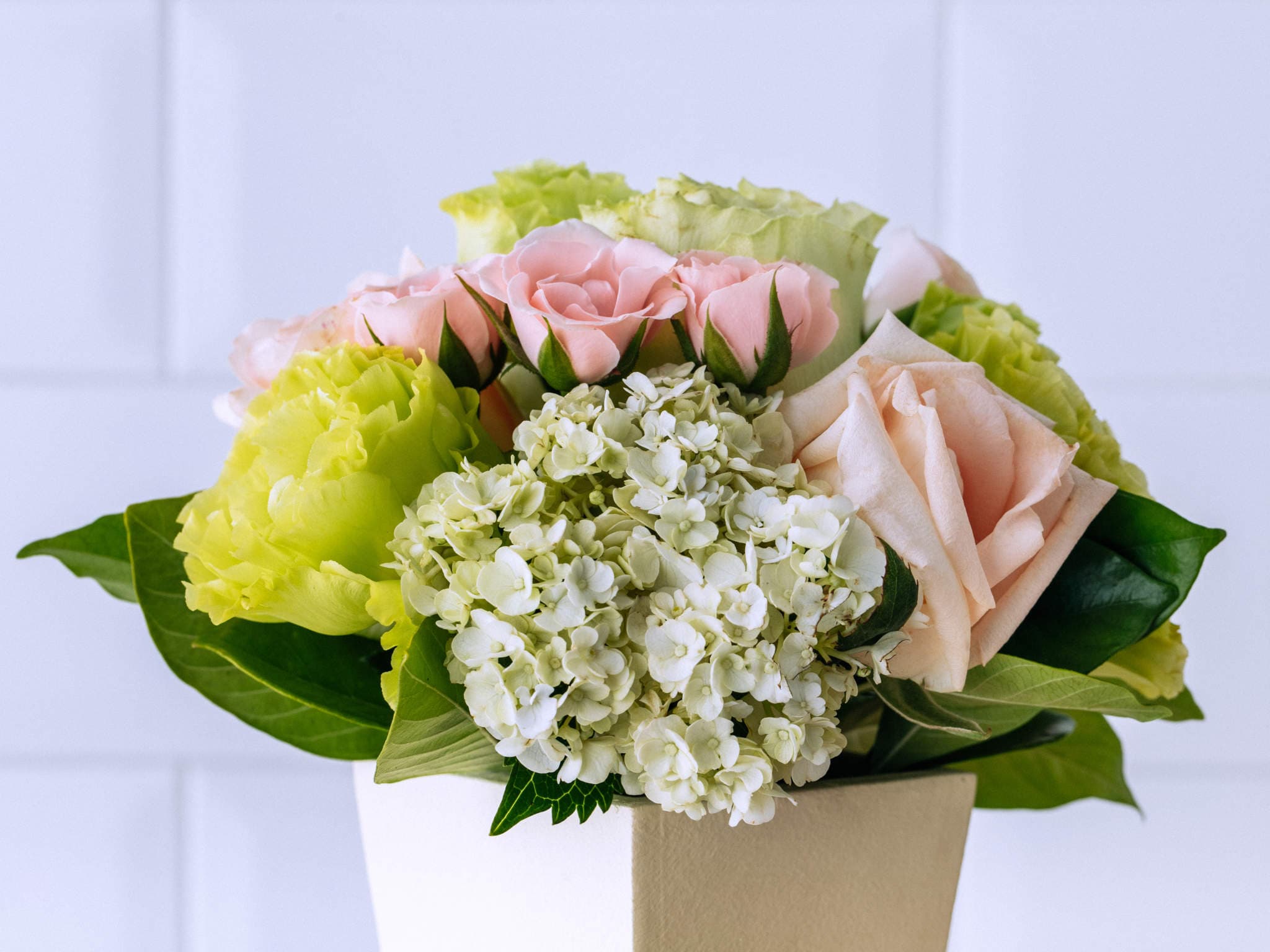 Arranjo de Rosas, Lisianthus e Hortênsias em Vaso de Madeira. Composição cuidadosamente preparada pela Petalá com flores frescas selecionadas, embalagem premium e cartão personalizado. Entrega expressa para todo o Brasil.