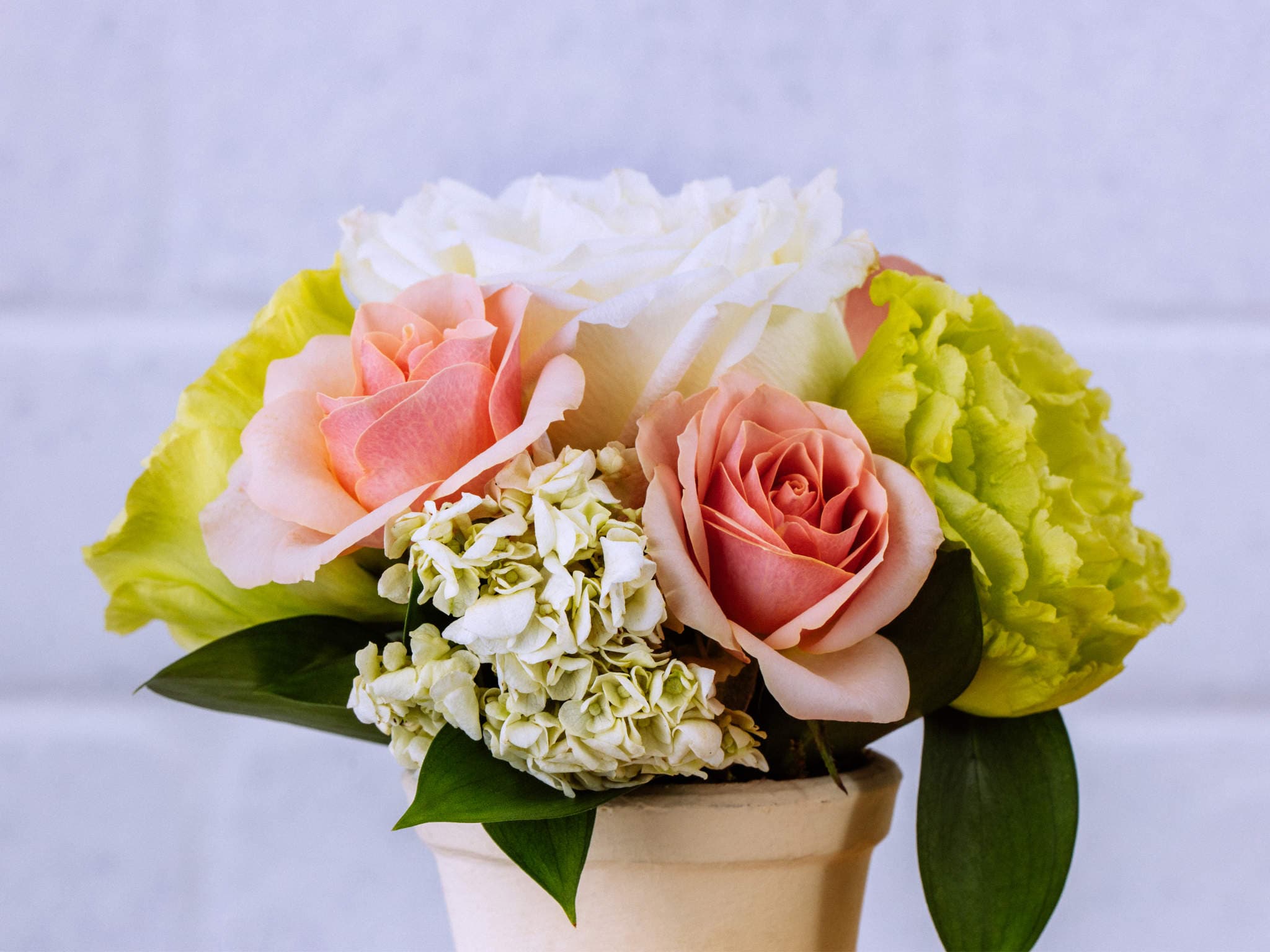 4.8Arranjo de Rosas e Alstroemérias Brancas em Vaso com Folhagens