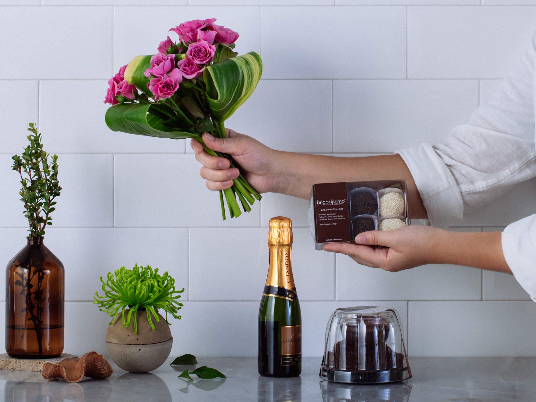 Cesta com Buquê de Rosas, Chandon, Brigadeiro e Bolo de Chocolate. Composição cuidadosamente preparada pela Petalá com flores frescas selecionadas, embalagem premium e cartão personalizado. Entrega expressa para todo o Brasil.