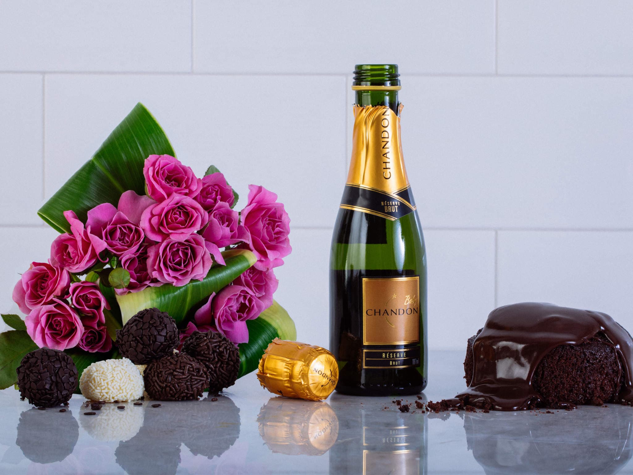 Cesta com Buquê de Rosas, Chandon, Brigadeiro e Bolo de Chocolate
