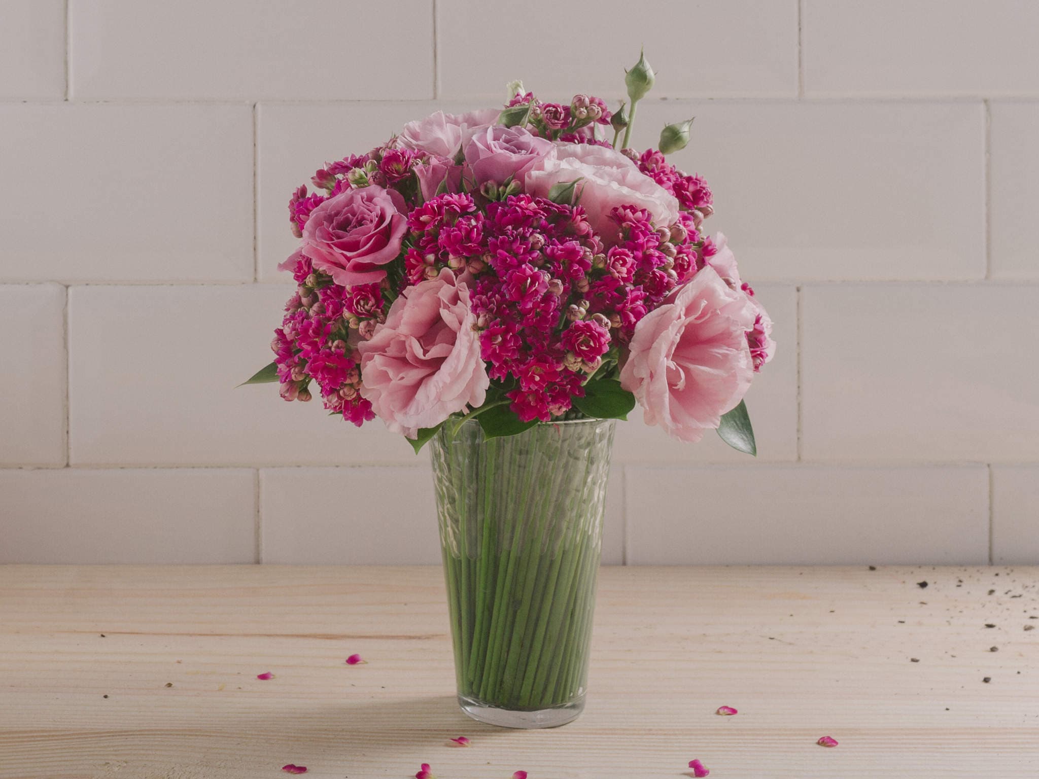 Arranjo de Lisianthus e Kalandivas Rosadas em Vaso Juana Martinez. Composição cuidadosamente preparada pela Petalá com flores frescas selecionadas, embalagem premium e cartão personalizado. Entrega expressa para todo o Brasil.