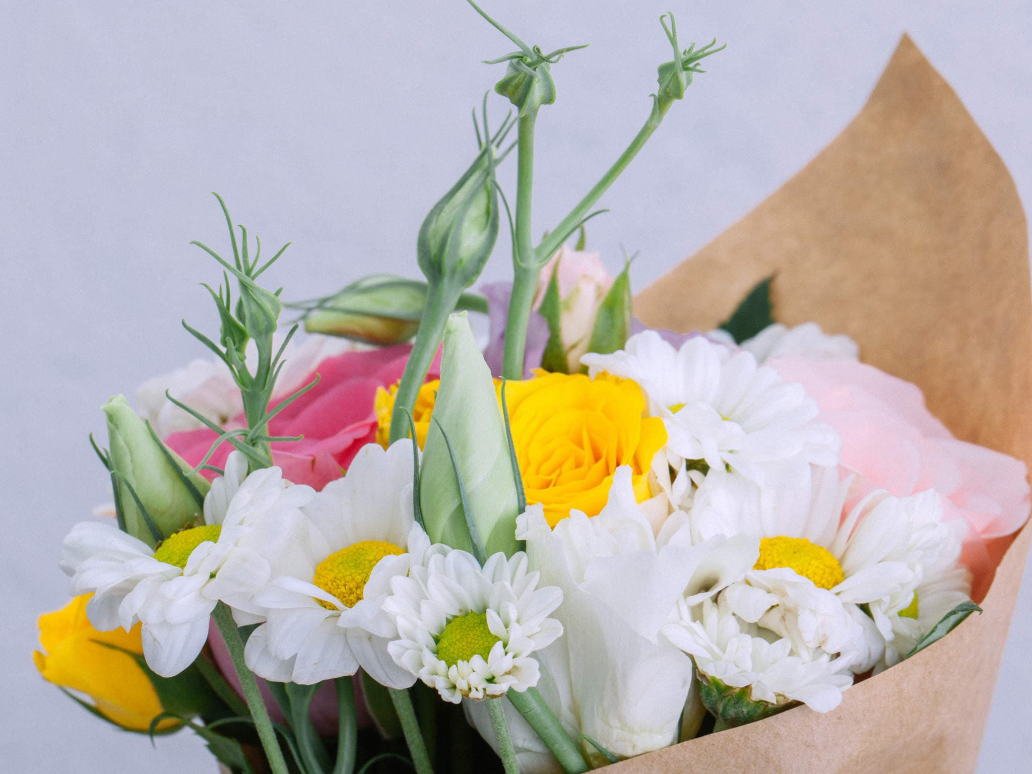 Buquê de Rosas, Lisianthus e Margaridinhas em Folha Kraft