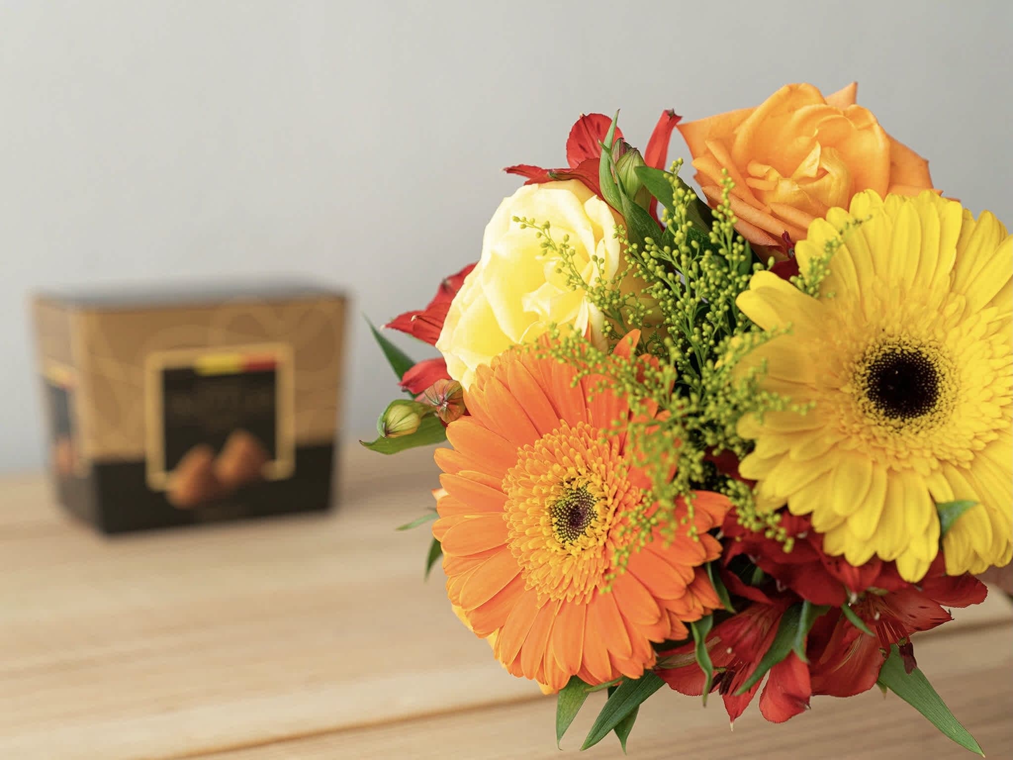 Raio de Sol e Trufas Belgas Para Entrega. Composição cuidadosamente preparada pela Petalá com flores frescas selecionadas, embalagem premium e cartão personalizado. Entrega expressa para todo o Brasil.
