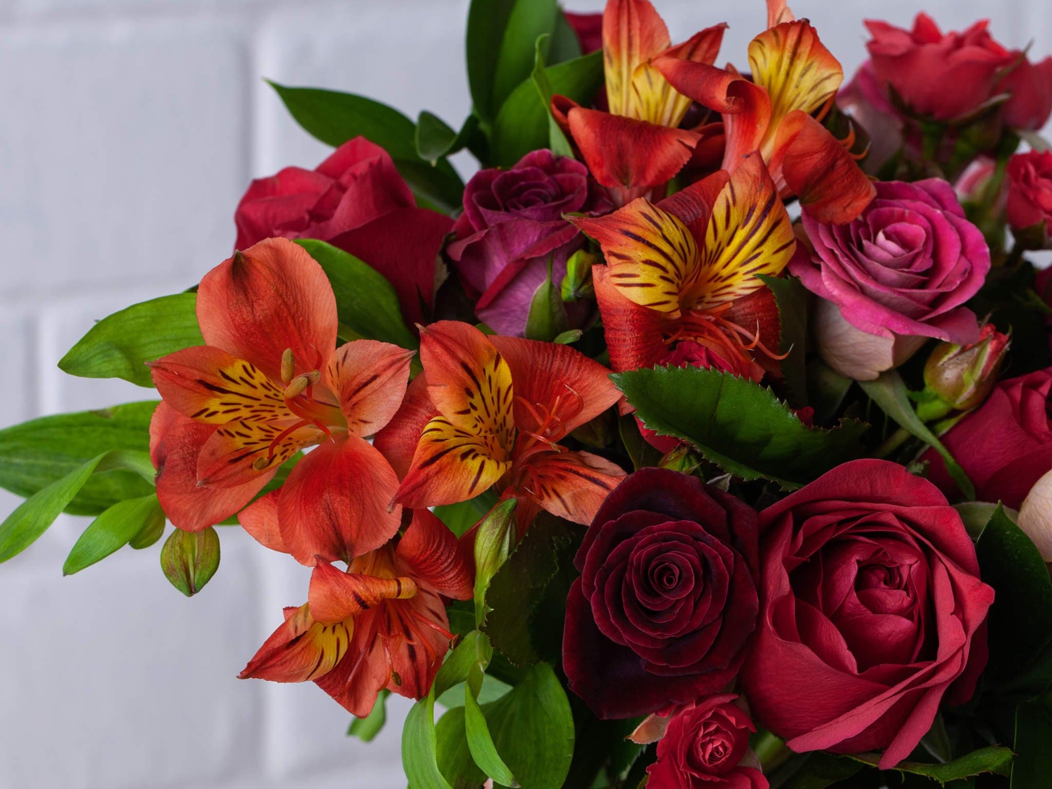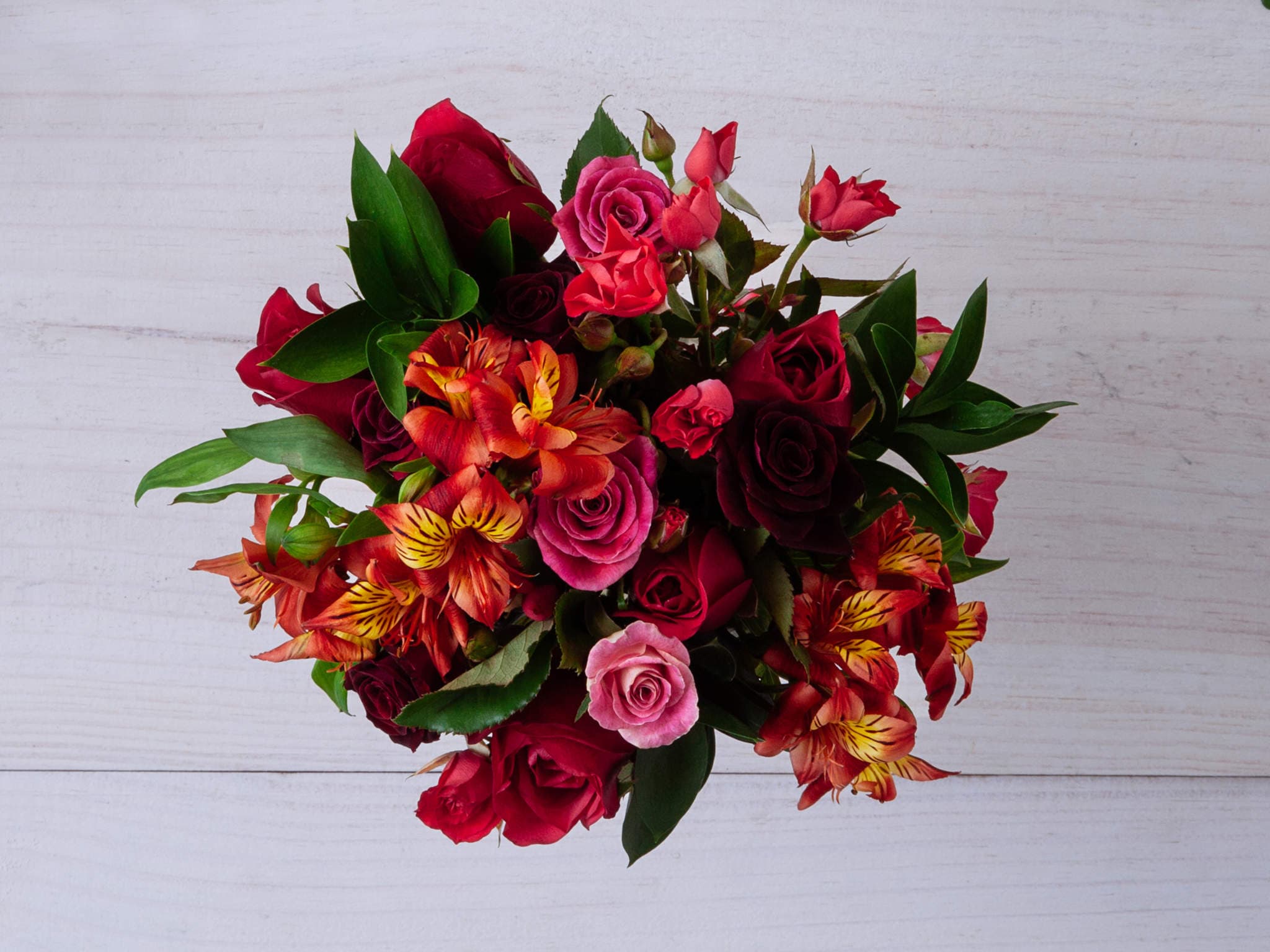 Arranjo de Rosas e Alstroemérias Vermelhas em Vaso. Composição cuidadosamente preparada pela Petalá com flores frescas selecionadas, embalagem premium e cartão personalizado. Entrega expressa para todo o Brasil.