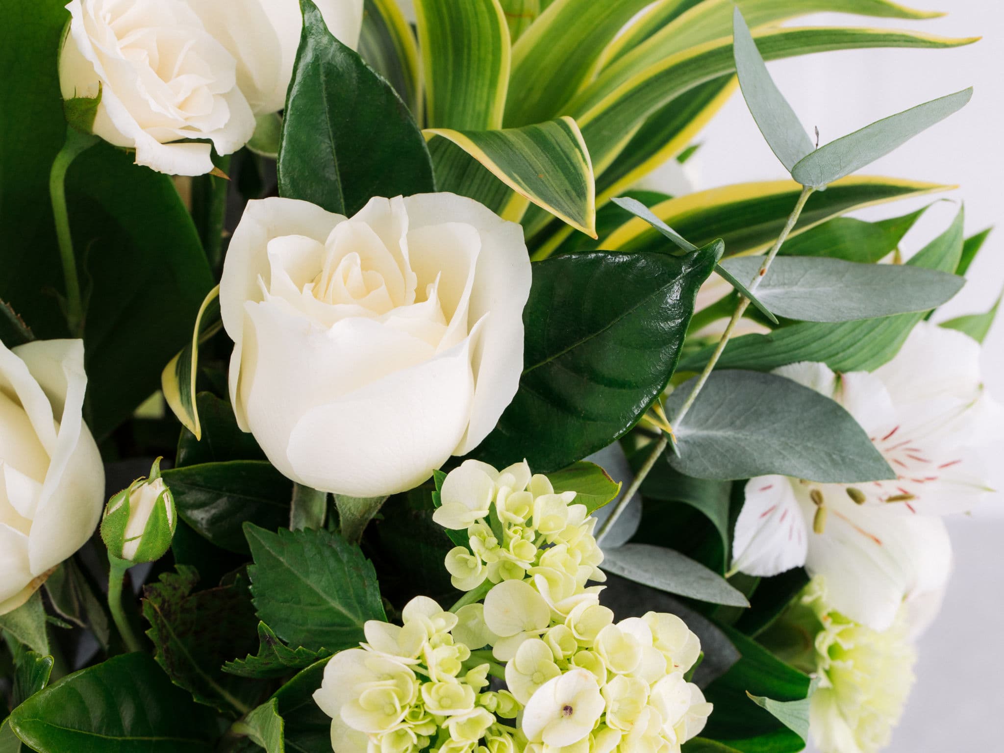 Arranjo de Rosas e Alstroemérias Brancas em Vaso com Folhagens. Composição cuidadosamente preparada pela Petalá com flores frescas selecionadas, embalagem premium e cartão personalizado. Entrega expressa para todo o Brasil.