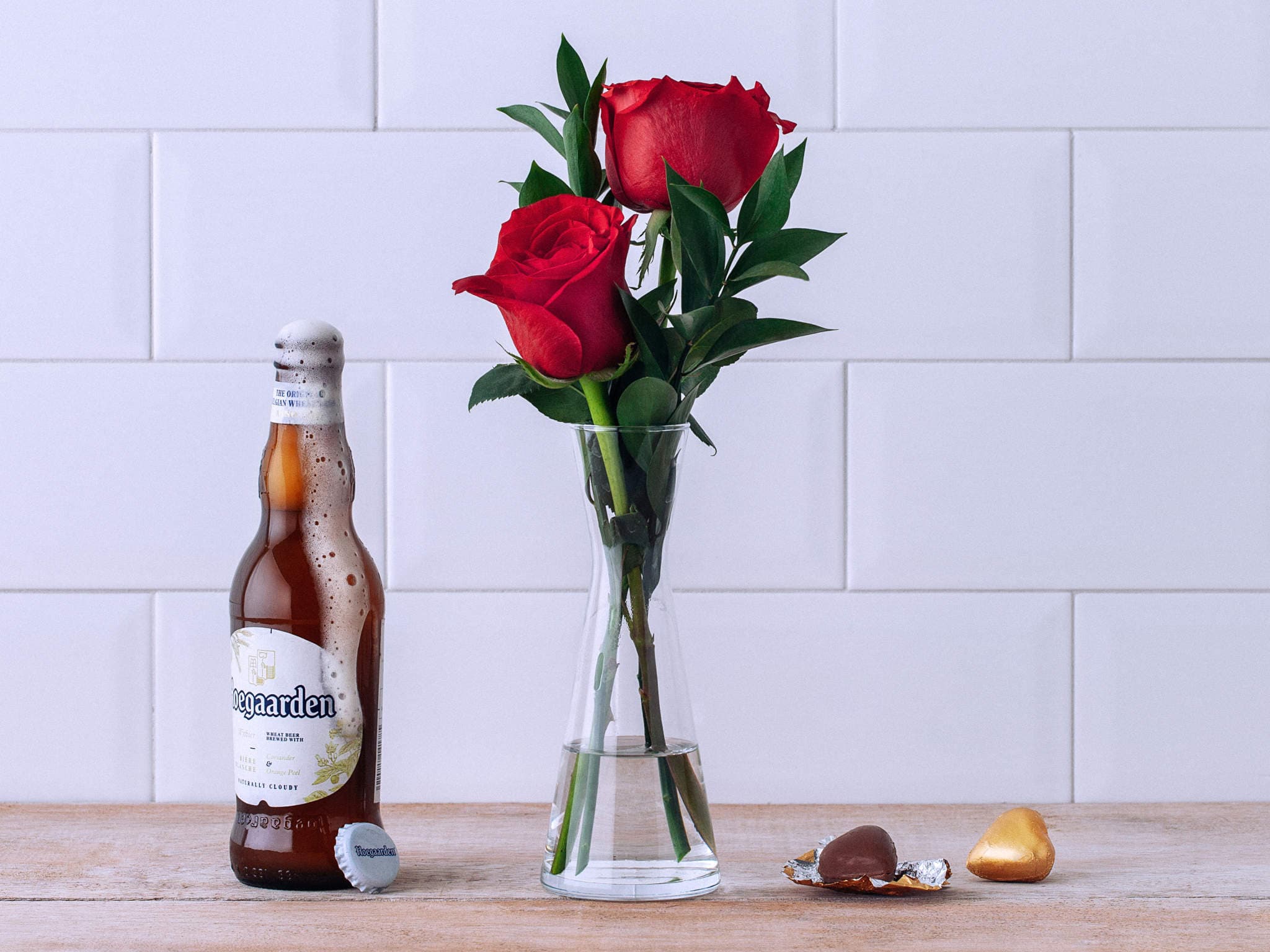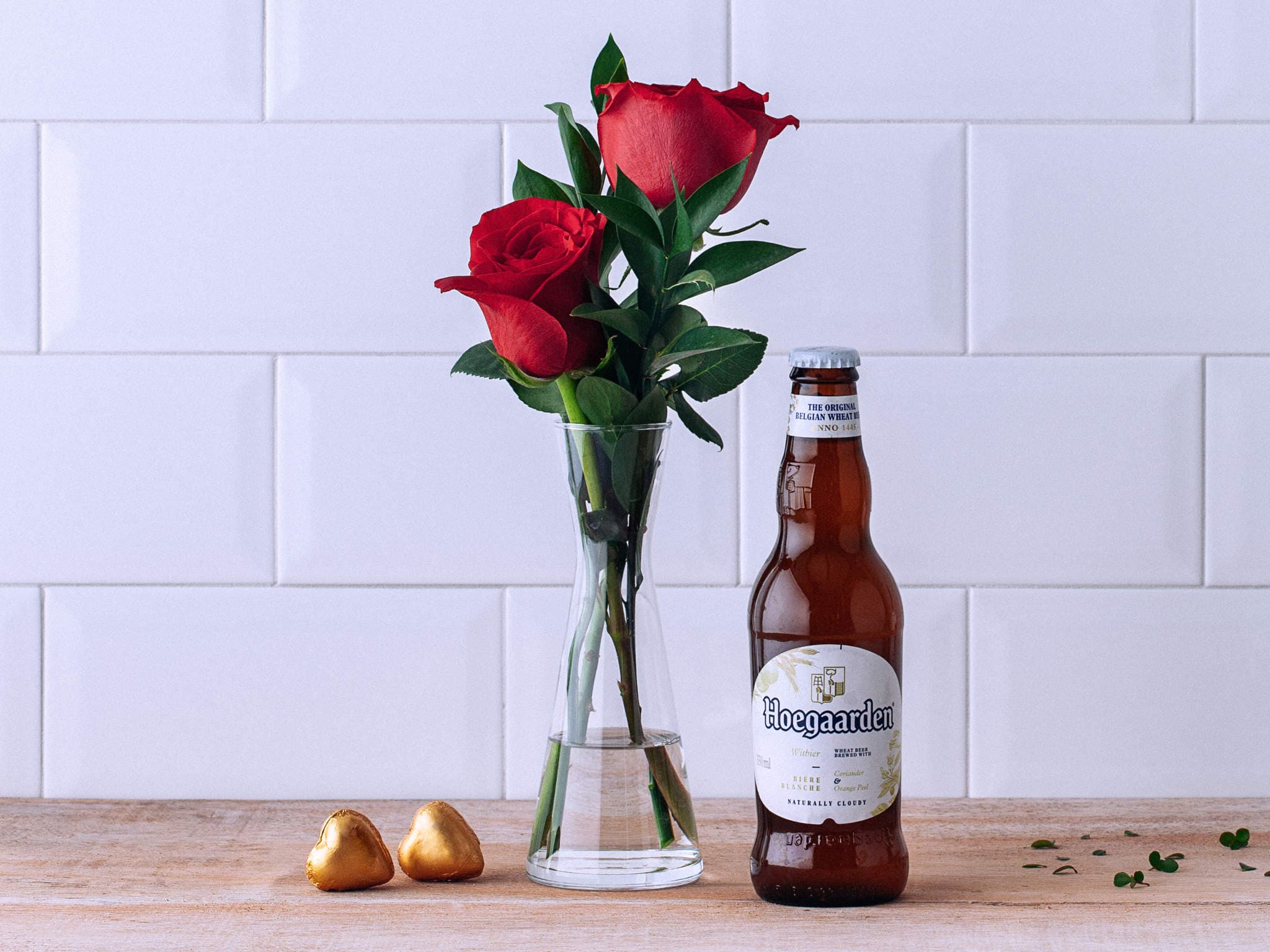 Arranjo de Rosas Vermelhas em Vaso com Chocolate e Cerveja Hoegaarden